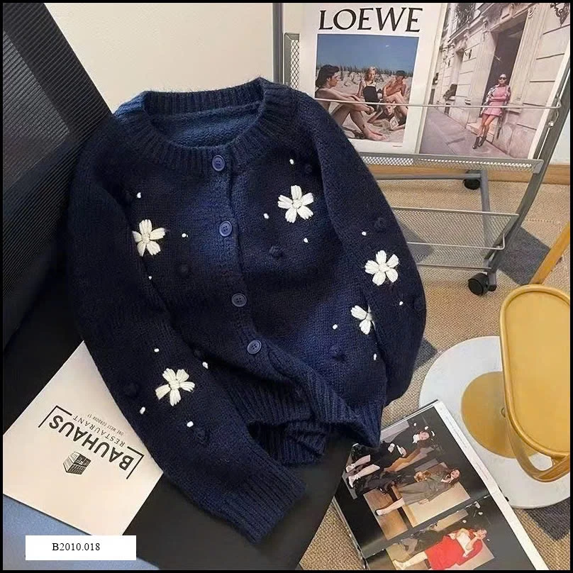 Áo len dày dặn, thiết kế cổ tròn và nút cài trước tiện lợi. Điểm nhấn là những bông hoa cúc nổi mềm mại, tạo vẻ nữ tính và trẻ trung. Áo có độ co giãn tốt, mặc ấm áp phù hợp cho mùa thu đông.