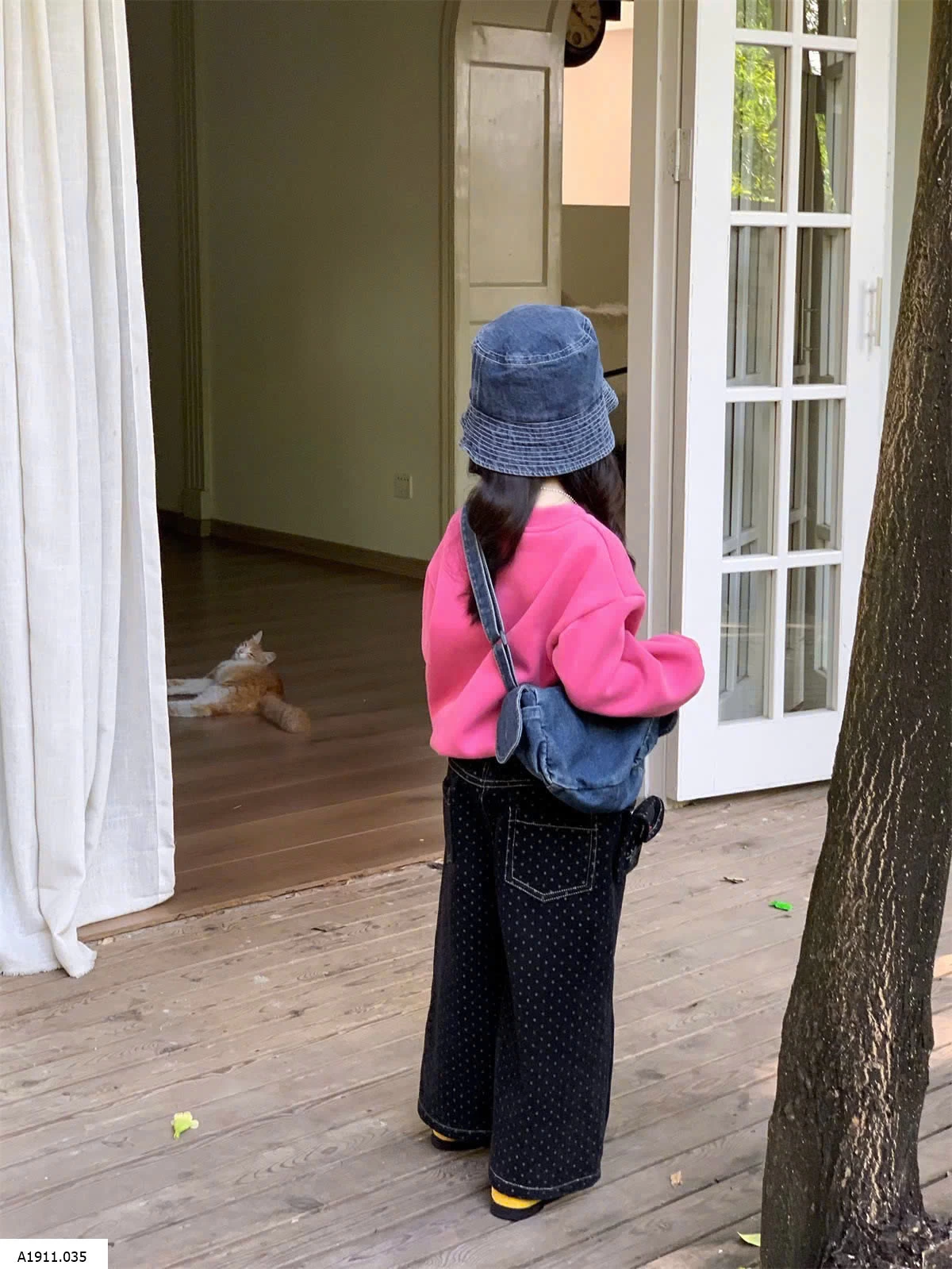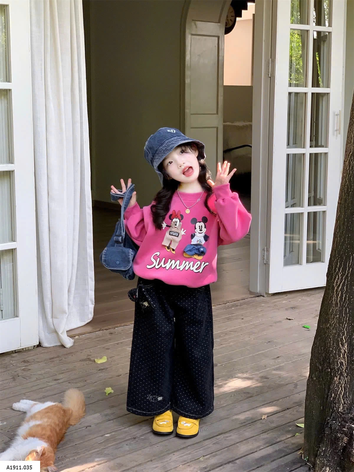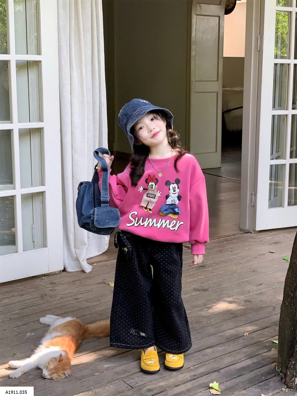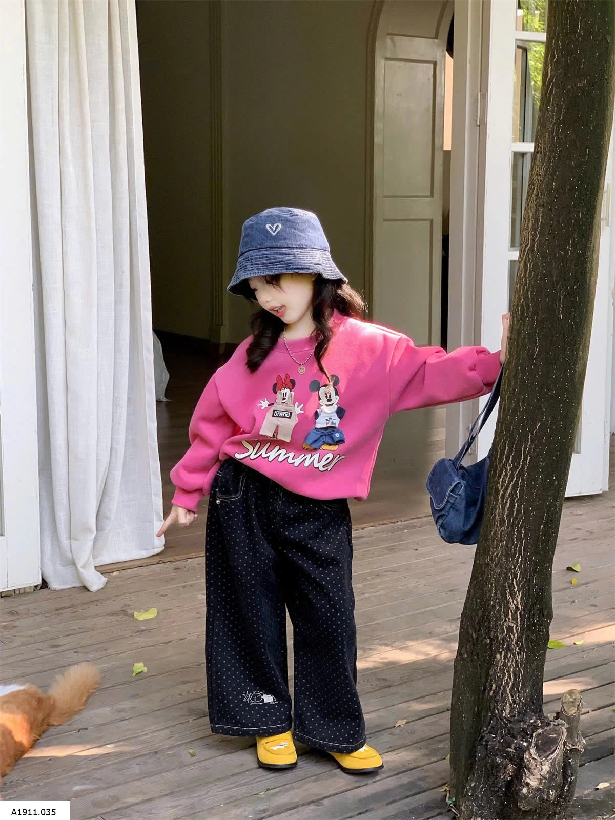 ÁO NỈ HỒNG MIX JEANS SUÔNG CHẤM BI Giá sỉ áo 181k quần 217k