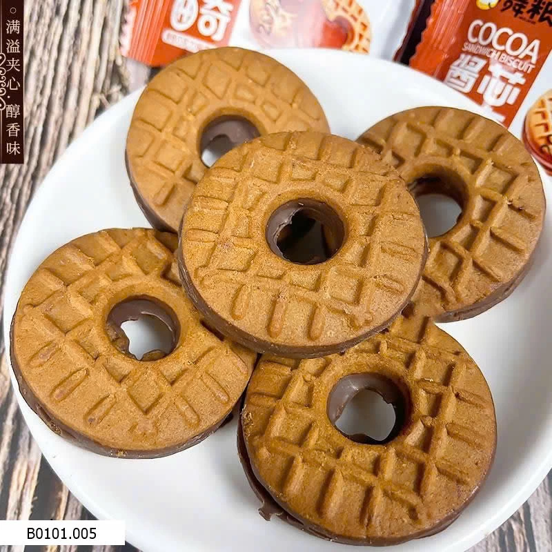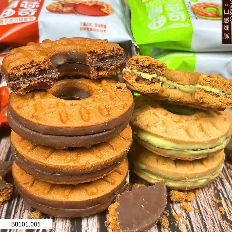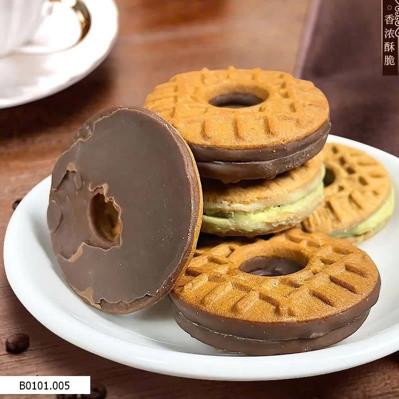 Bánh quy sandwich giòn thơm, kẹp kem béo mịn. Vị ngọt vừa, không gắt, ăn không ngán