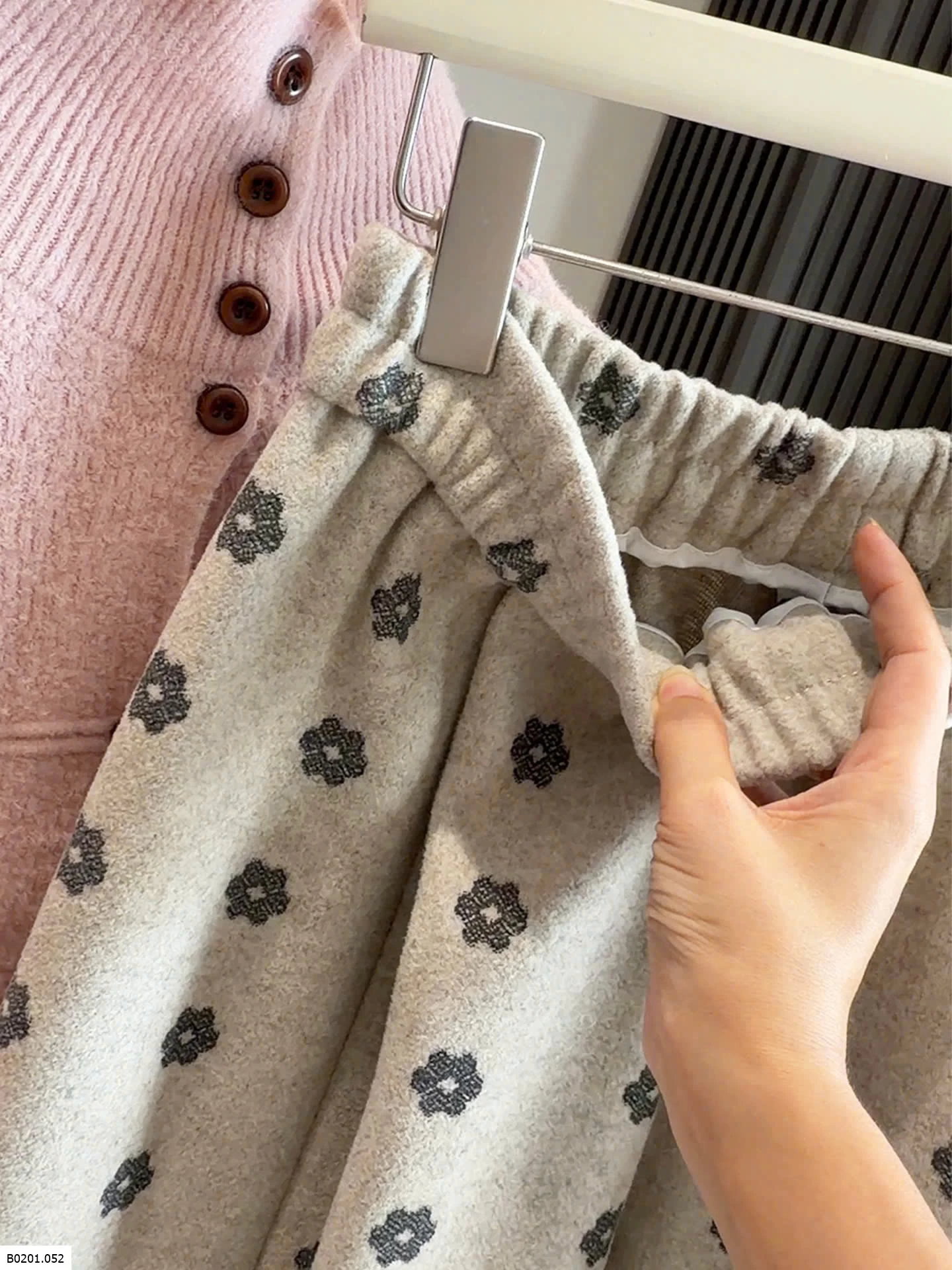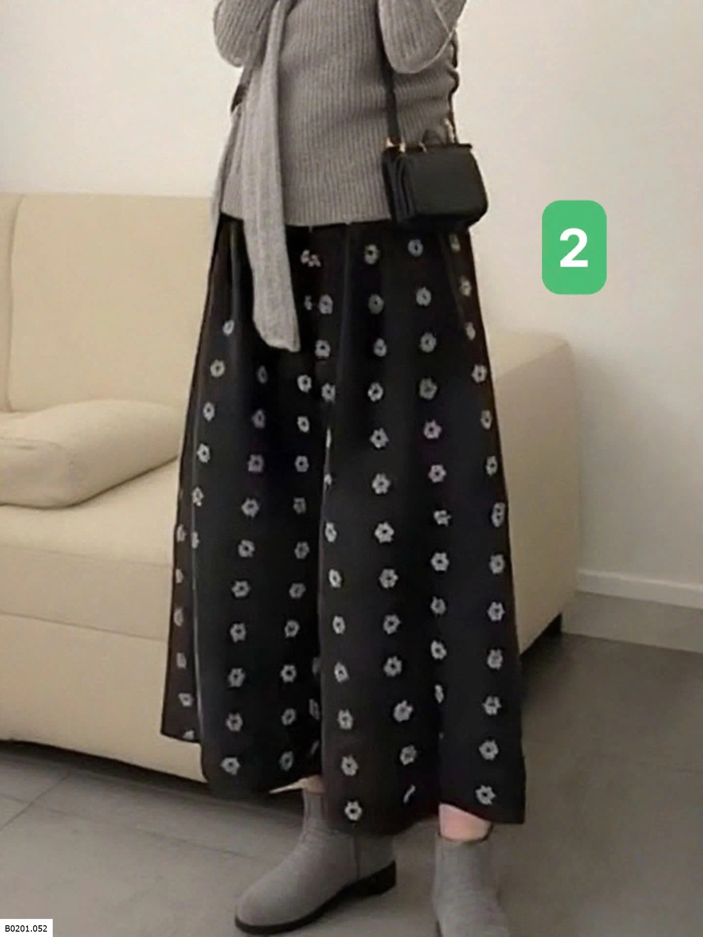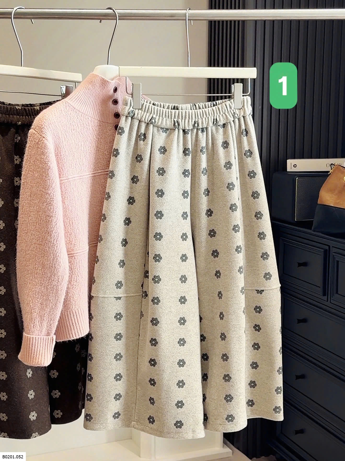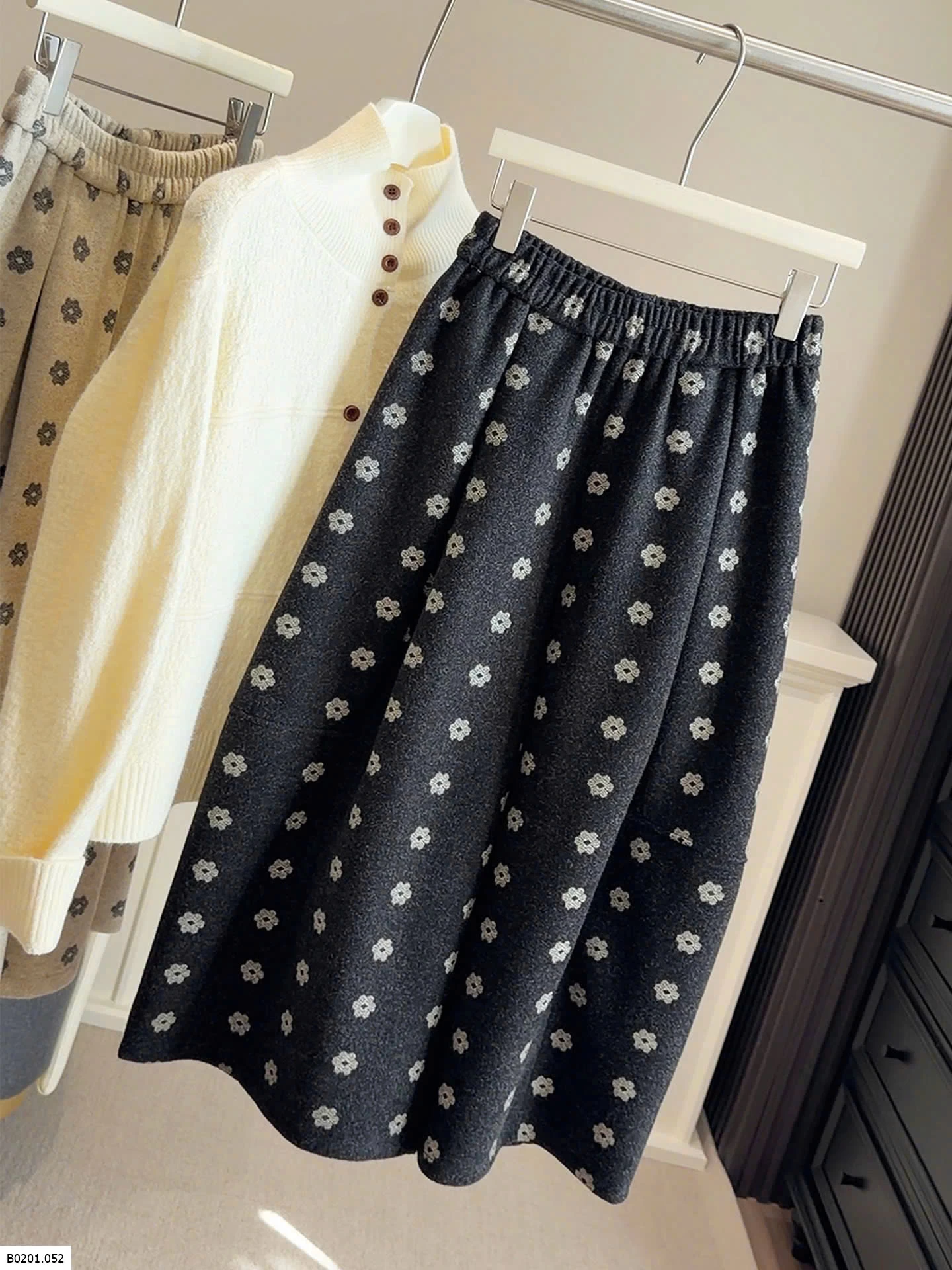 Chân váy dạ mềm, họa tiết hoa nhỏ vintage. Cạp chun co giãn, dáng xòe nhẹ dễ phối áo len cardigan
