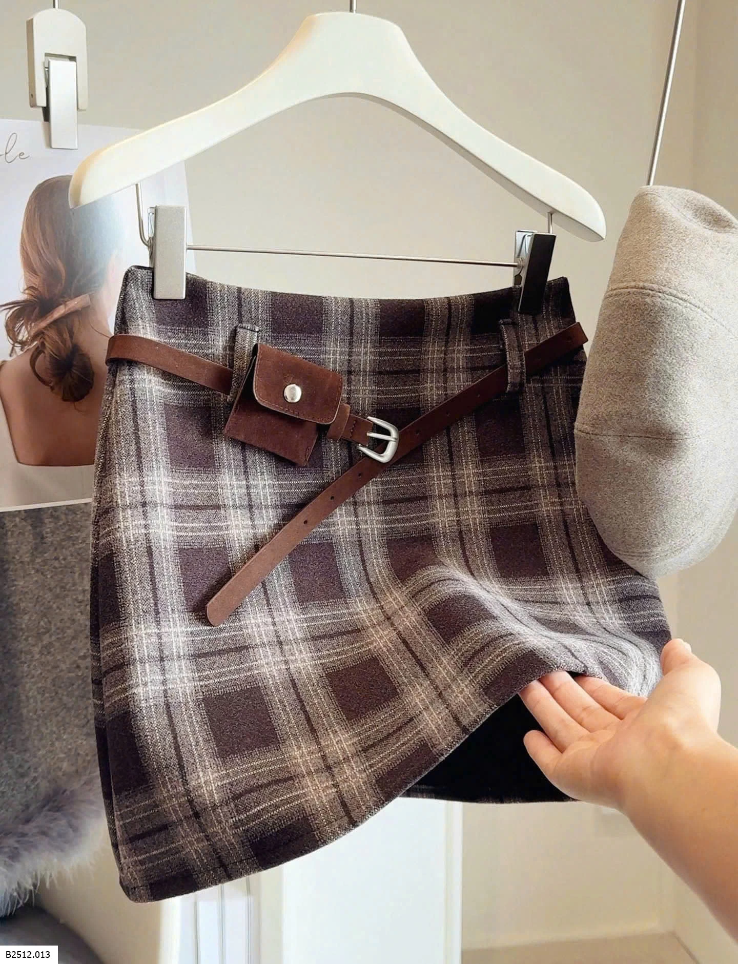 Chân váy dạ kẻ phong cách thanh lịch, form đứng, có belt đi kèm tạo điểm nhấn gọn dáng.