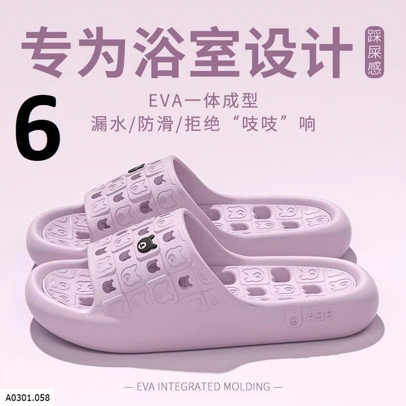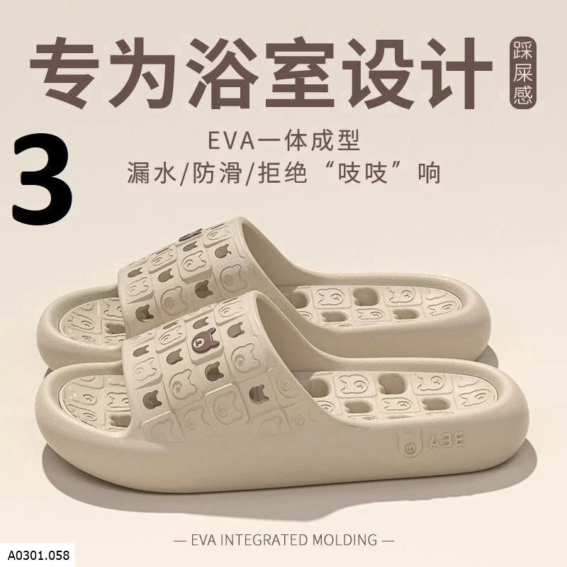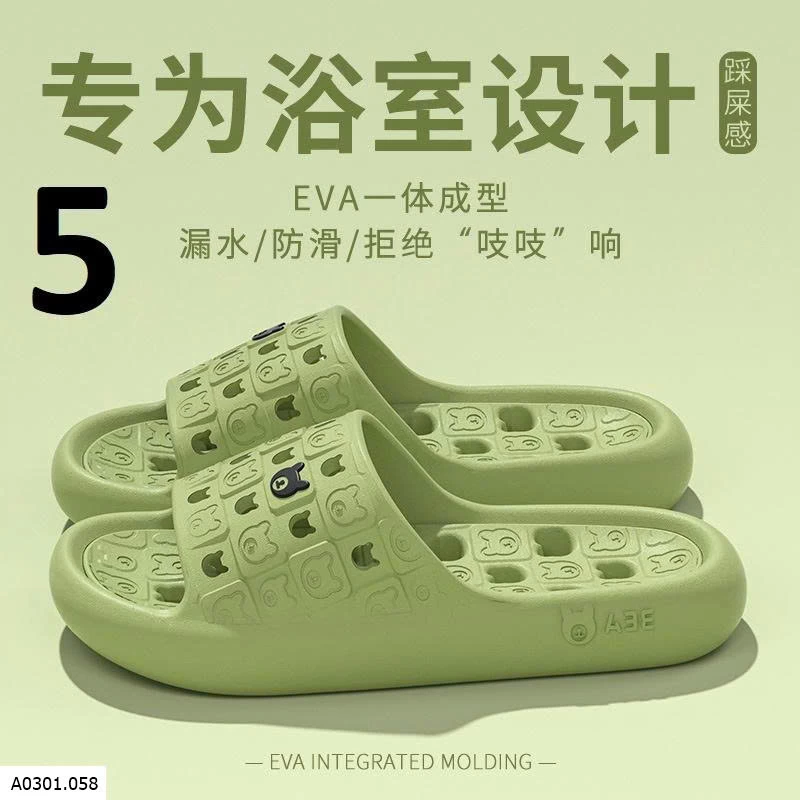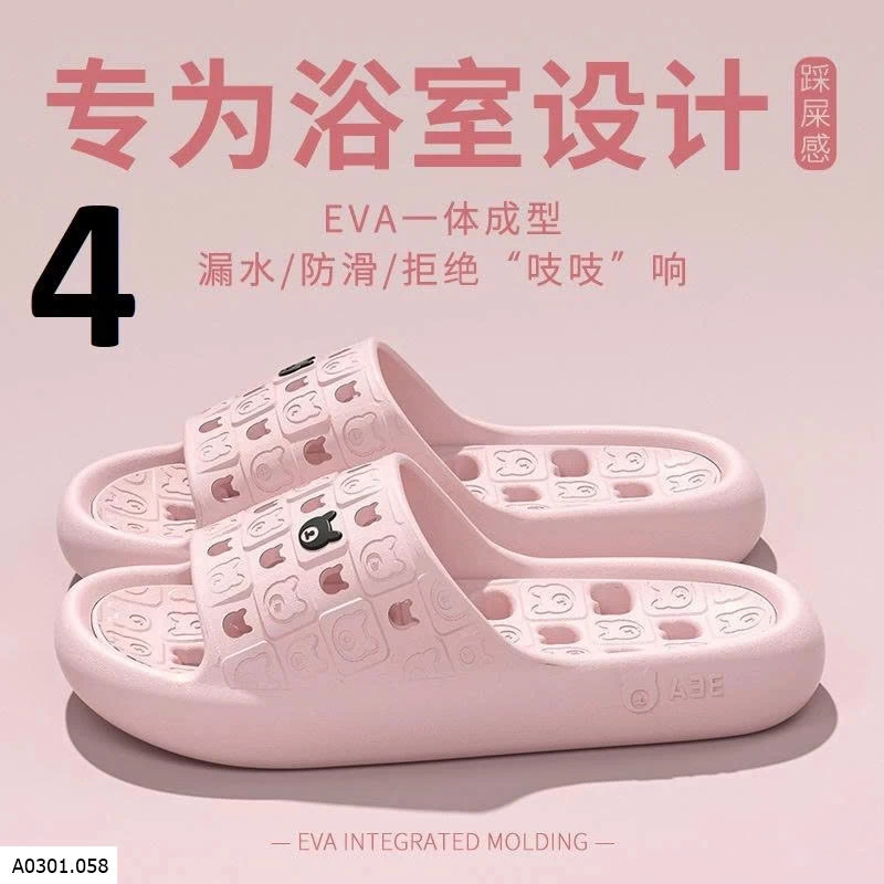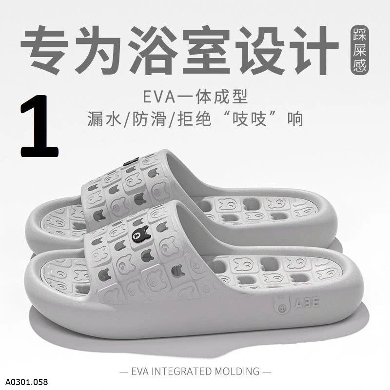 Dép EVA đúc nguyên khối, mềm nhẹ đi êm chân. Thiết kế thoát nước + chống trơn trượt, hạn chế trượt ngã trong nhà tắm