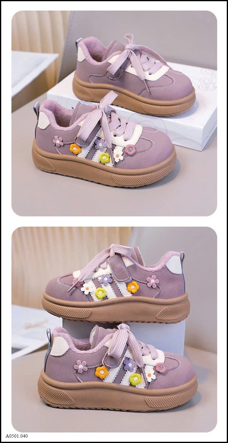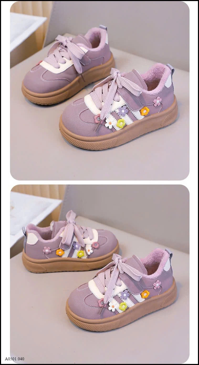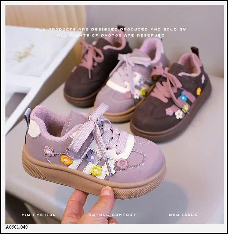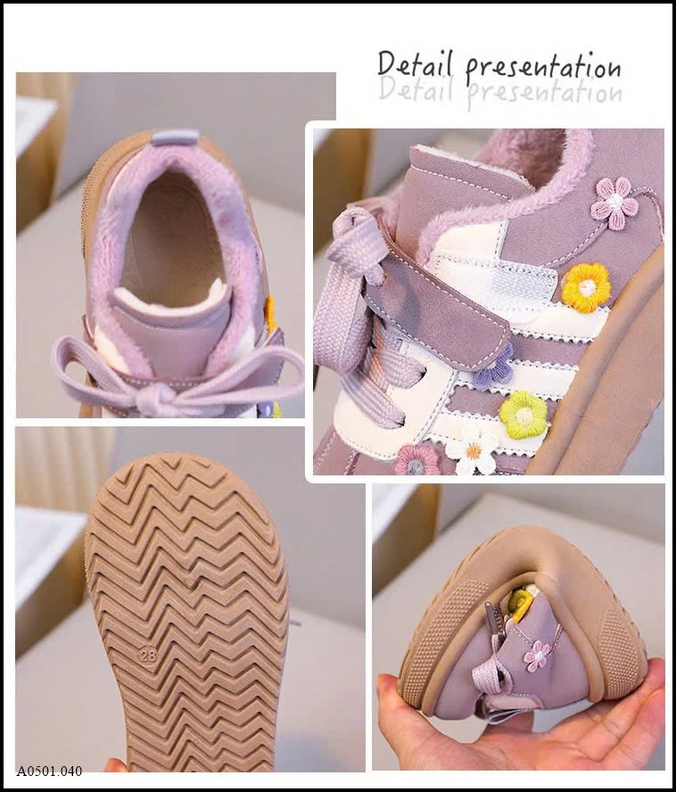 Thiết kế dễ thương với họa tiết hoa thêu nổi, phối dây buộc + quai dán tiện lợi. Form giày chắc chắn, mũi bo tròn giúp bảo vệ chân bé khi chạy nhảy