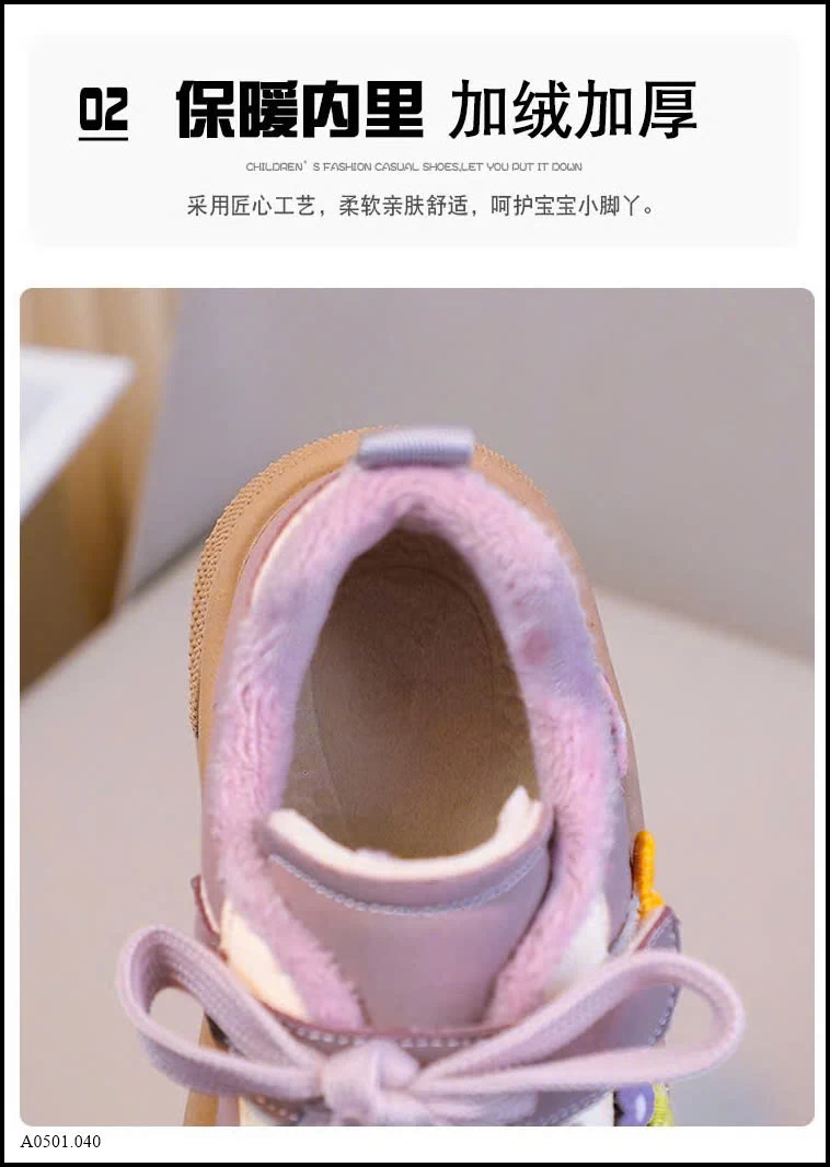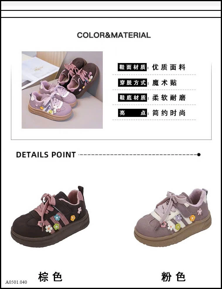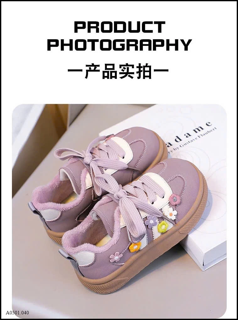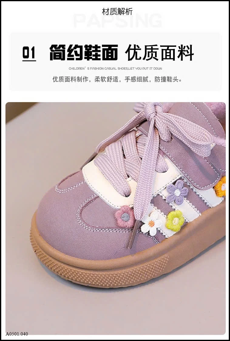 Thiết kế dễ thương với họa tiết hoa thêu nổi, phối dây buộc + quai dán tiện lợi. Form giày chắc chắn, mũi bo tròn giúp bảo vệ chân bé khi chạy nhảy