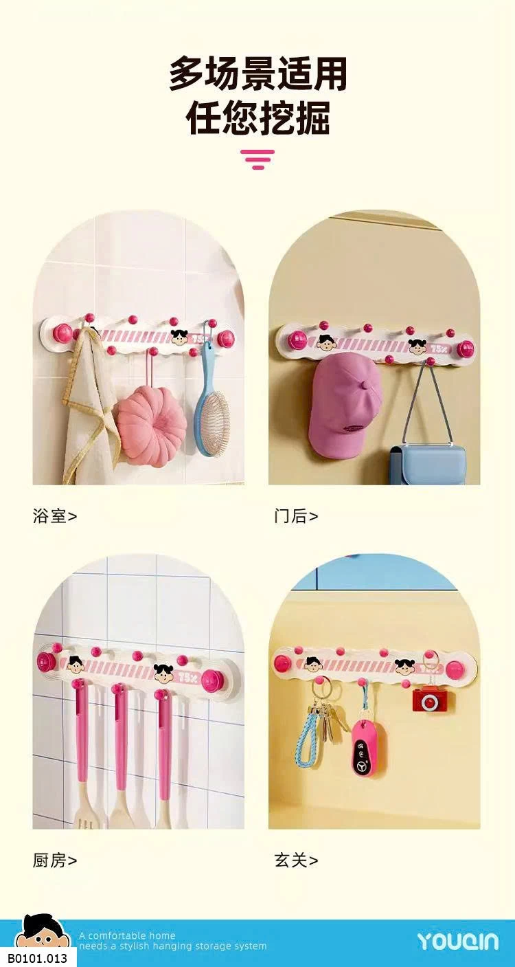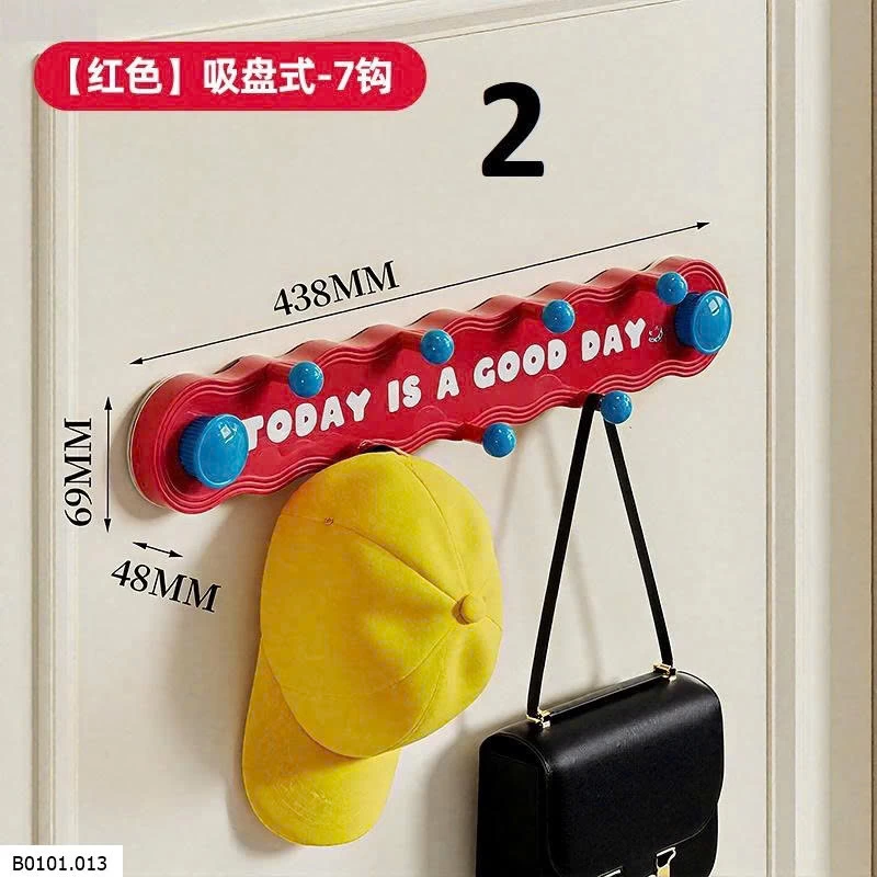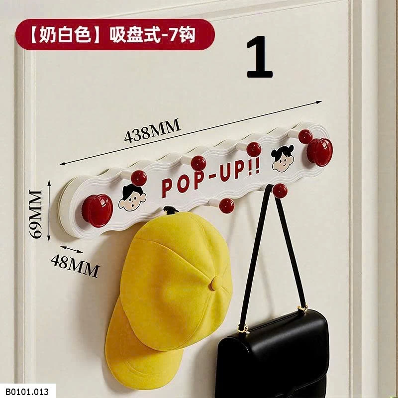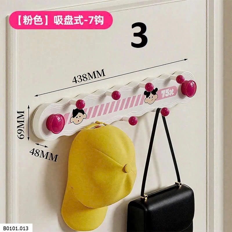 Thiết kế hút chân không, dán chắc không cần khoan tường. 7 móc treo tiện lợi: treo mũ, túi xách, áo khoác, khăn, phụ kiện