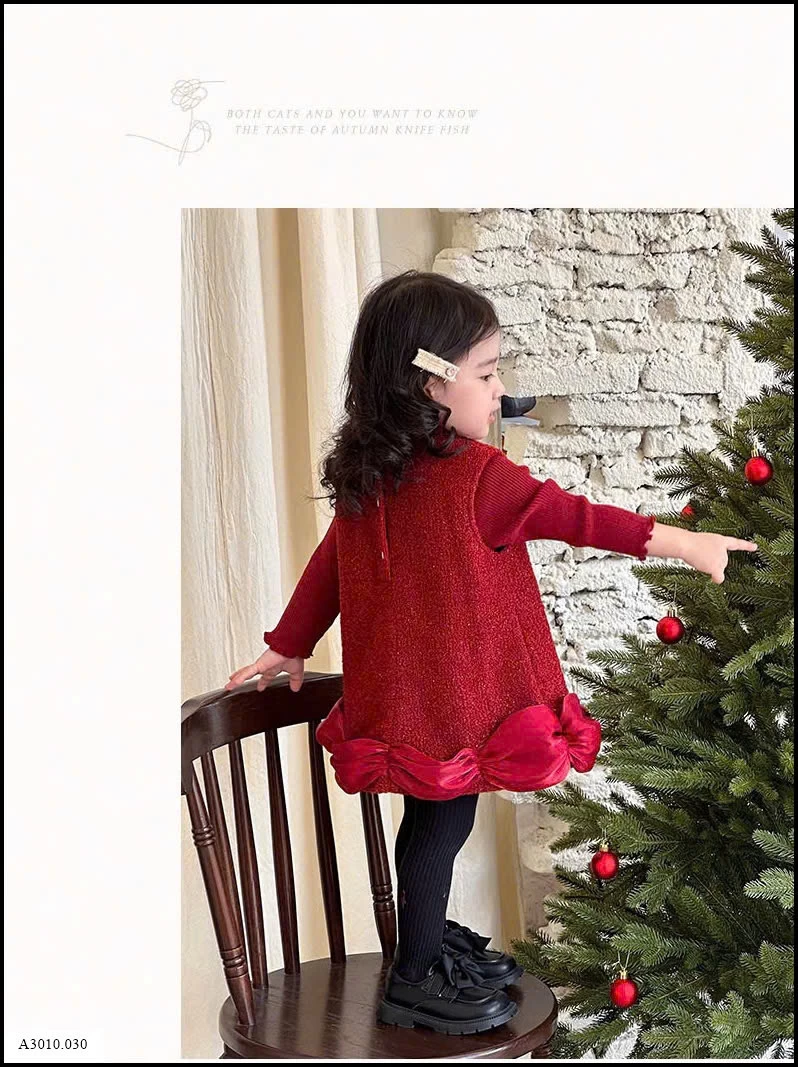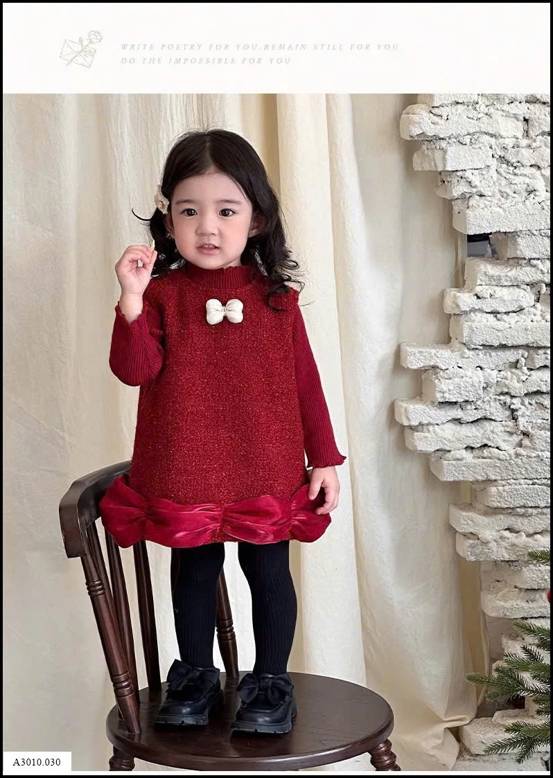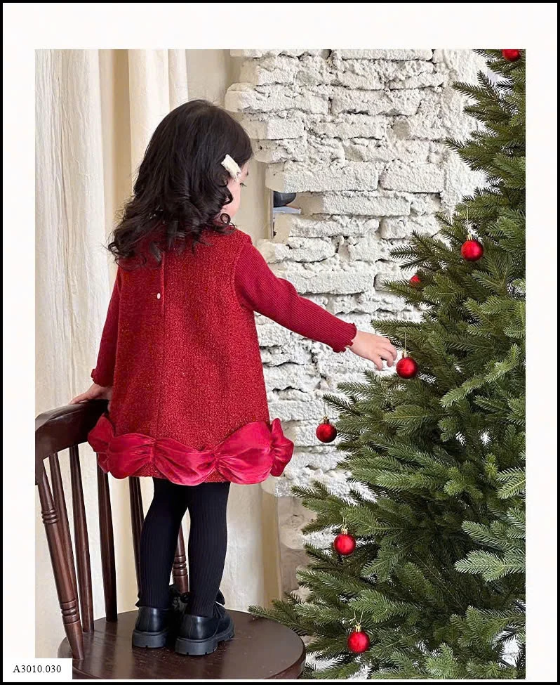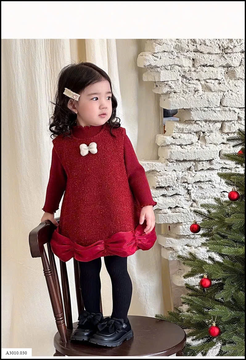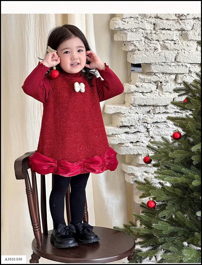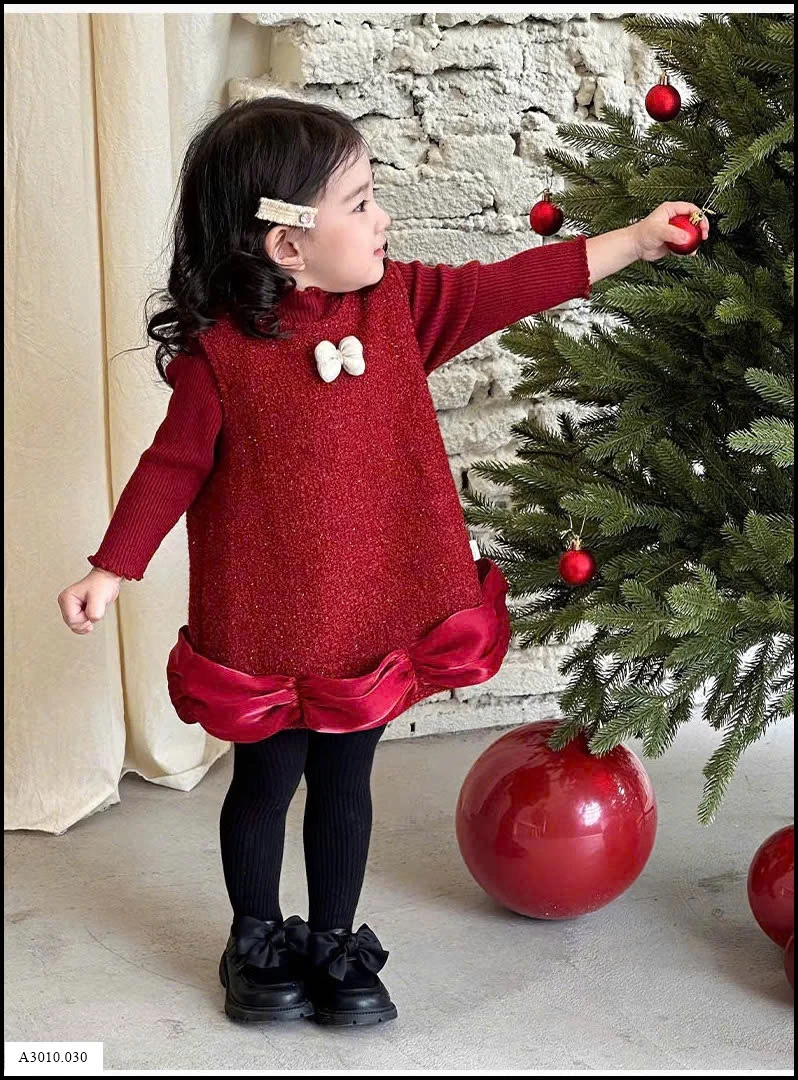 SET VÁY PHỐI ÁO LEN ĐỎ KÈM NƠ TRẮNG BÉ GÁI