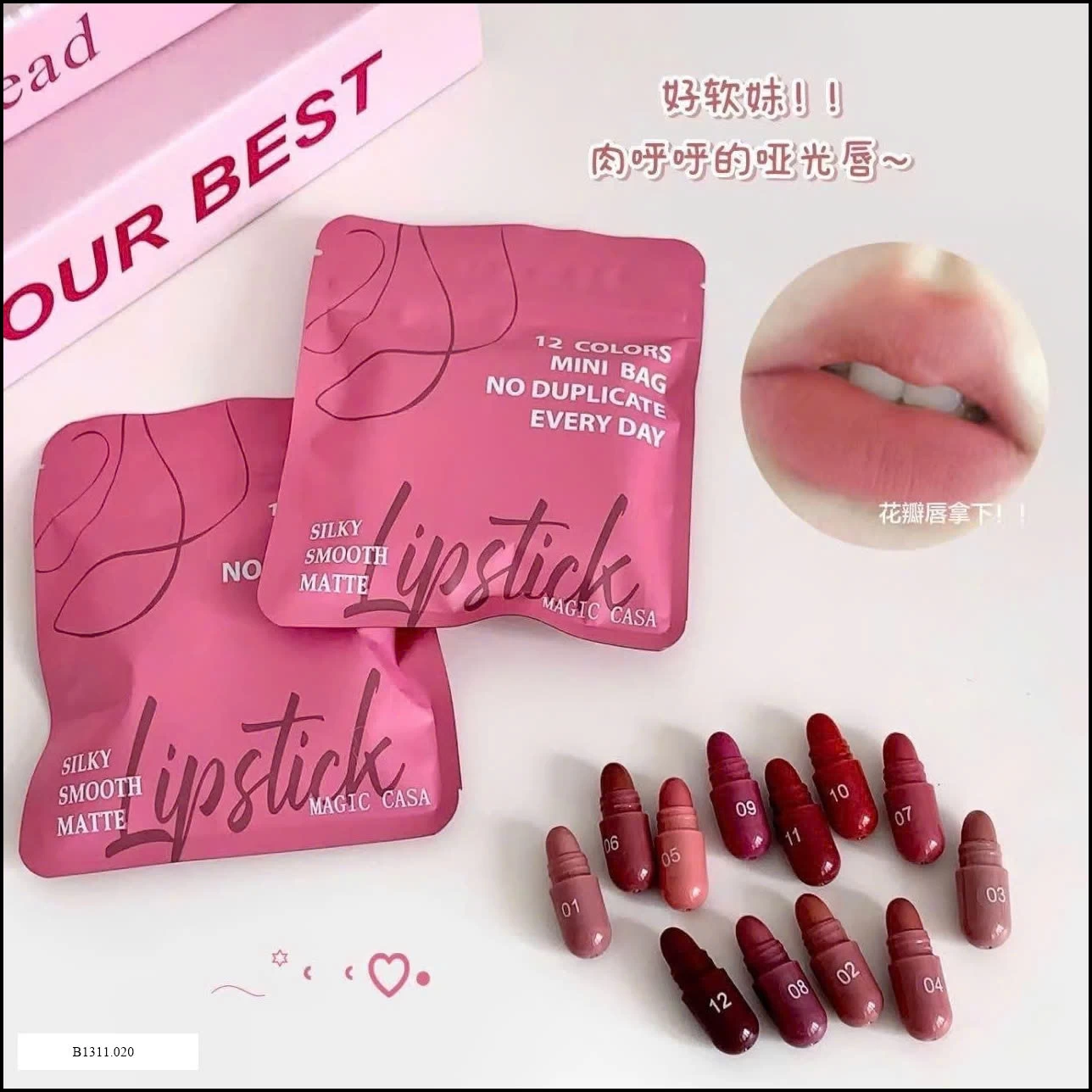 Son sáp nội địa thiết kế dạng viên thuốc độc đáo, bảng màu 12 tone thời thượng, lên môi mềm mượt, giữ ẩm tốt, không gây khô môi.