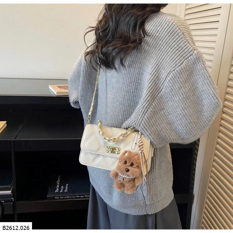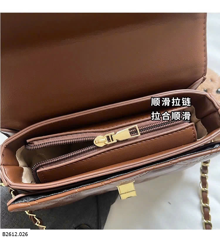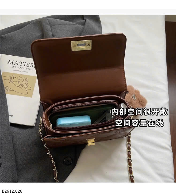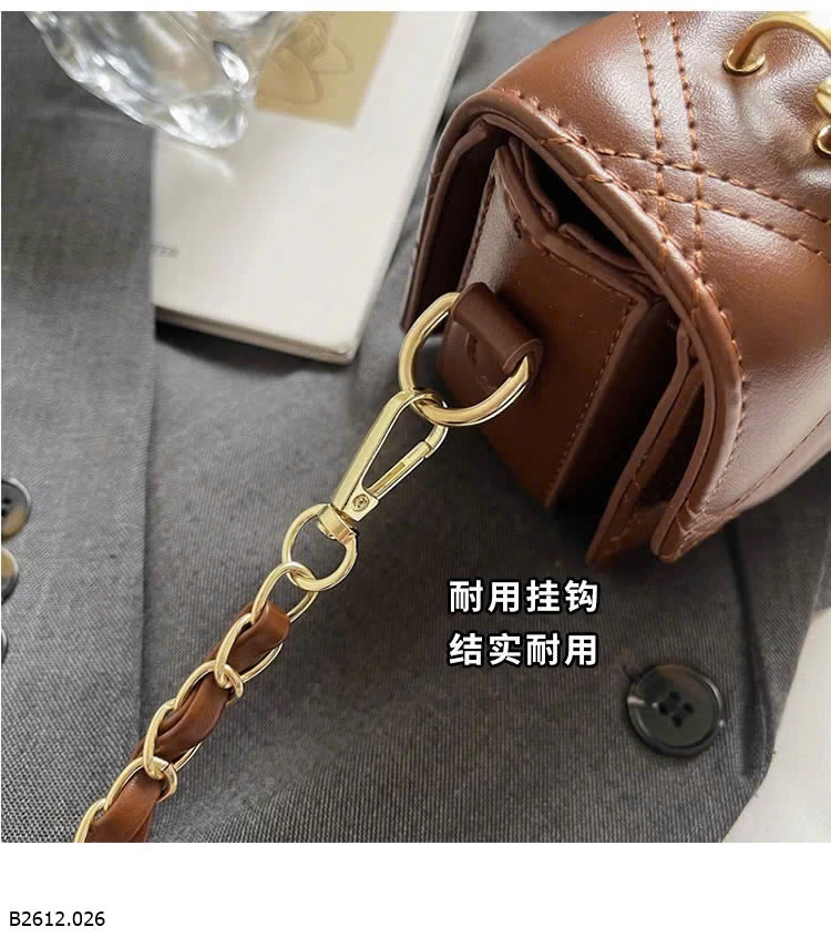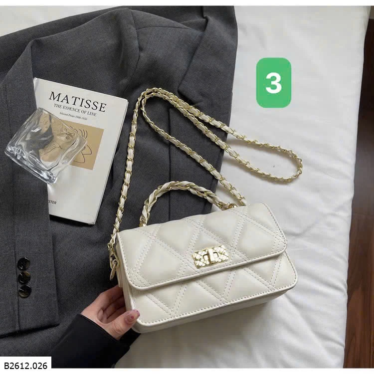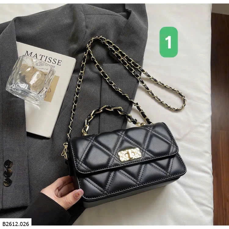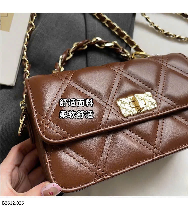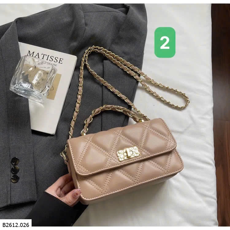 Thiết kế chần trám sang trọng, form nhỏ gọn dễ phối đồ. Khóa xoay kim loại chắc chắn, quai xích cầm tay + đeo chéo