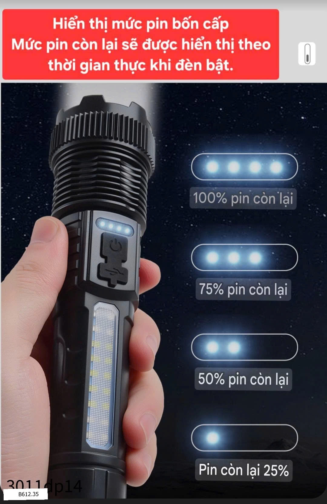 👉Trên thân Đèn có dãy Led xanh hiển thị mức pin bốn cấp, hiển thị pin 25%, 50%, 75% và 100%.
