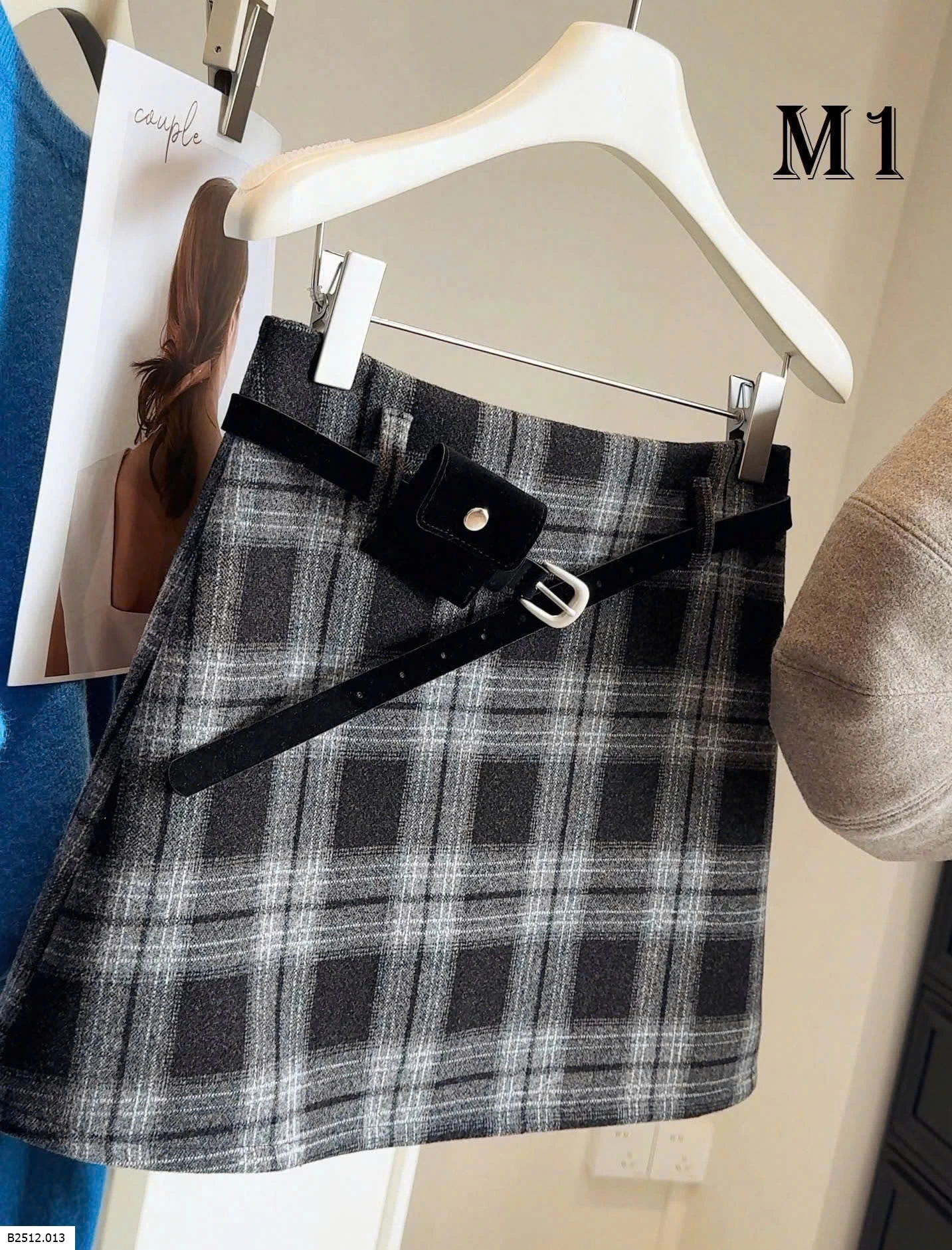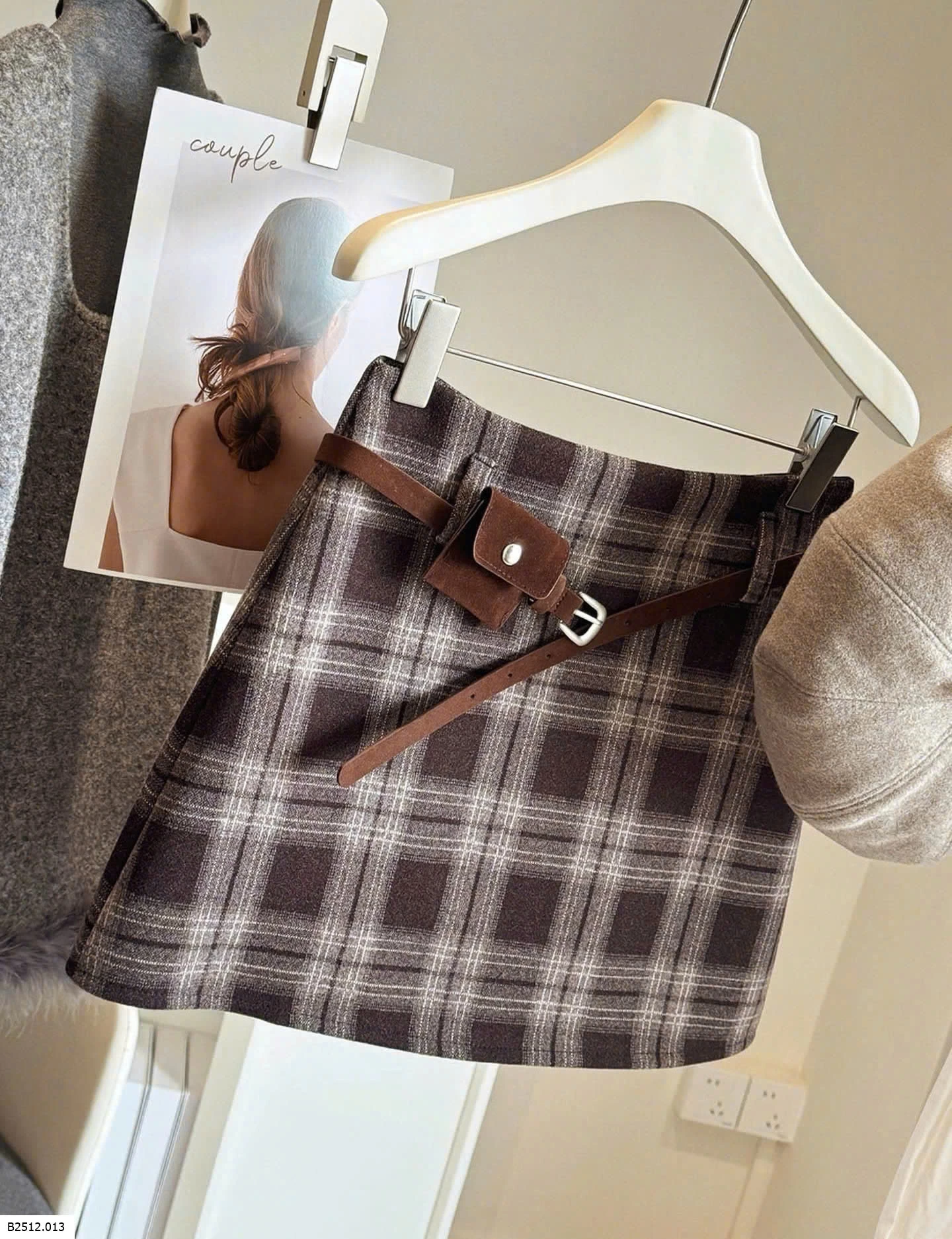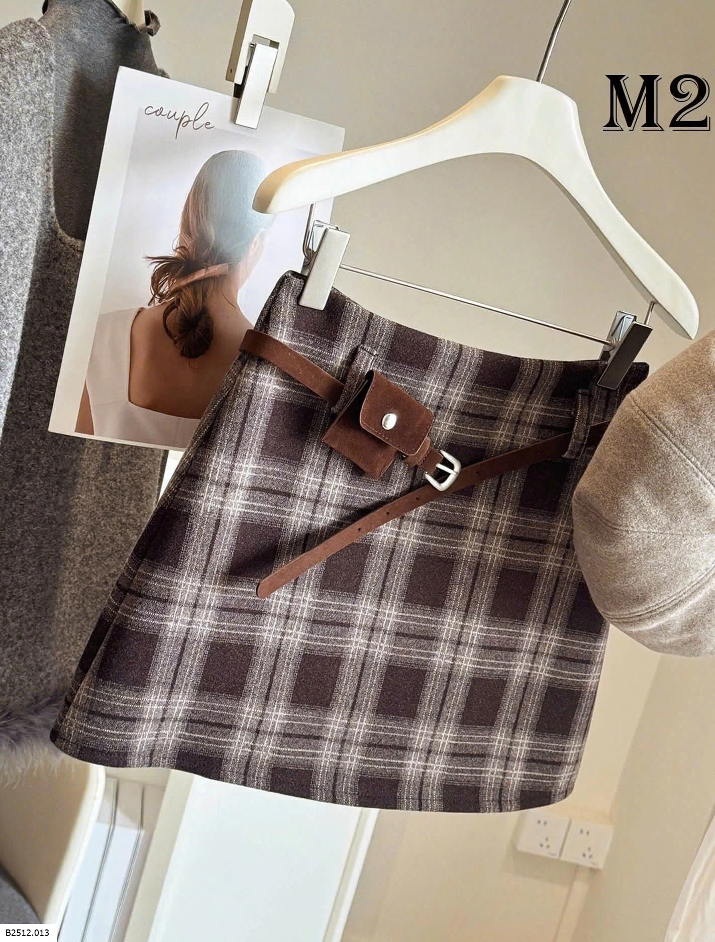 Chân váy dạ kẻ phong cách thanh lịch, form đứng, có belt đi kèm tạo điểm nhấn gọn dáng.