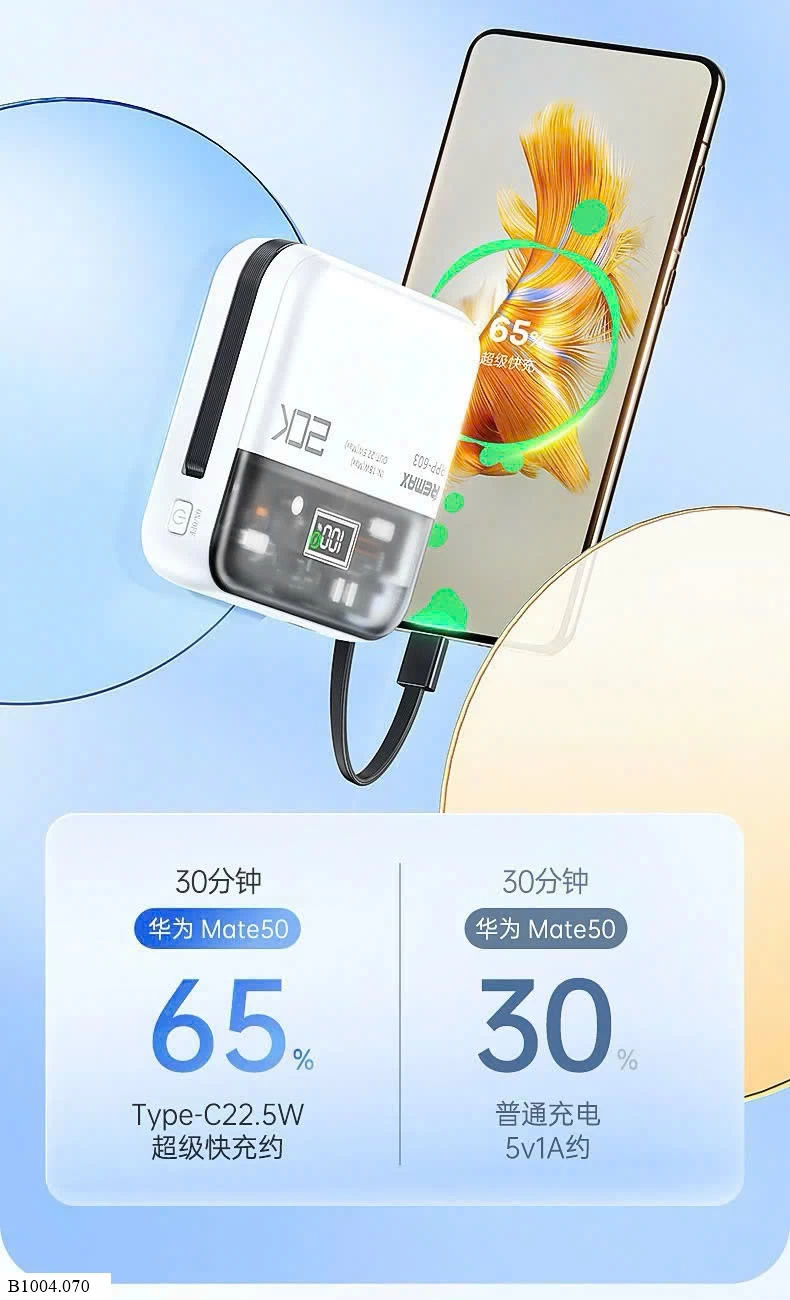 Sạc nhanh 65% trong 30 phút, rất gọn gàng khi mang theo đi du lịch hay đi làm