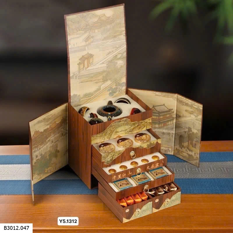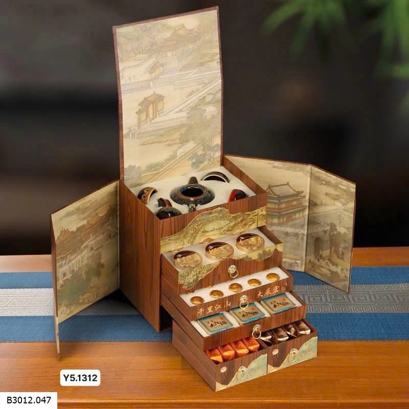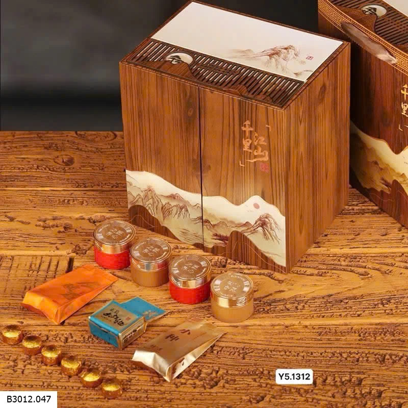 Một hộp quà có tận 6 loại trà thượng hạng, tặng kèm bộ ấm chén xinh thế này mà đem tặng hoặc bày Tết thì hết ý 🥰 Hộp đóng gỗ vừa sang vừa chắc chắn. Cầm đi biếu ngụ ý chúc tiền vào như nước, quá ấn tượng phải không ạ 😆