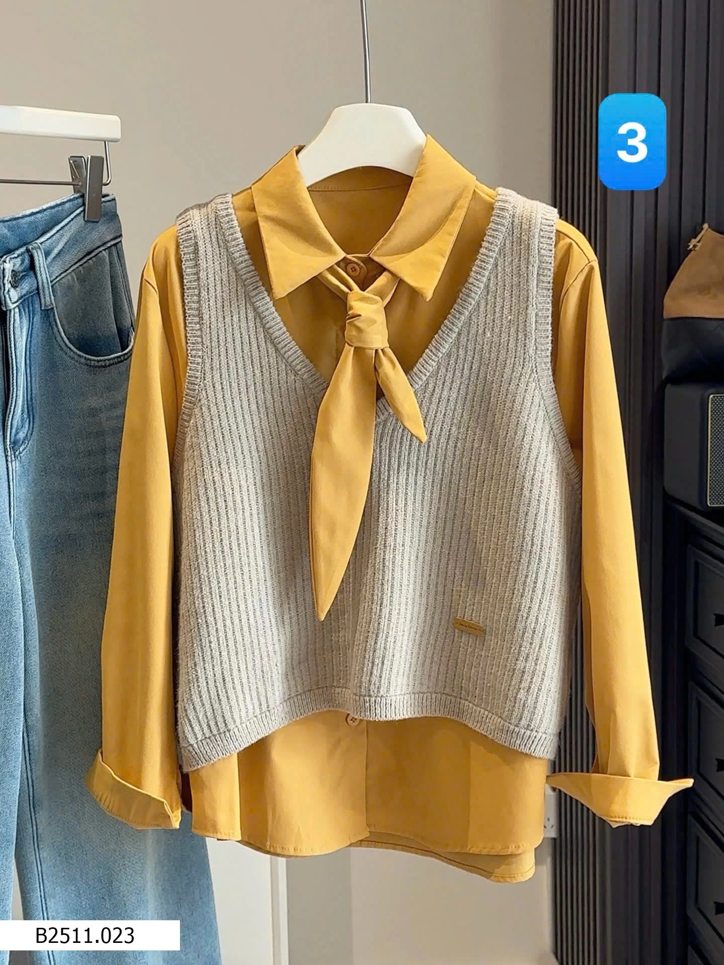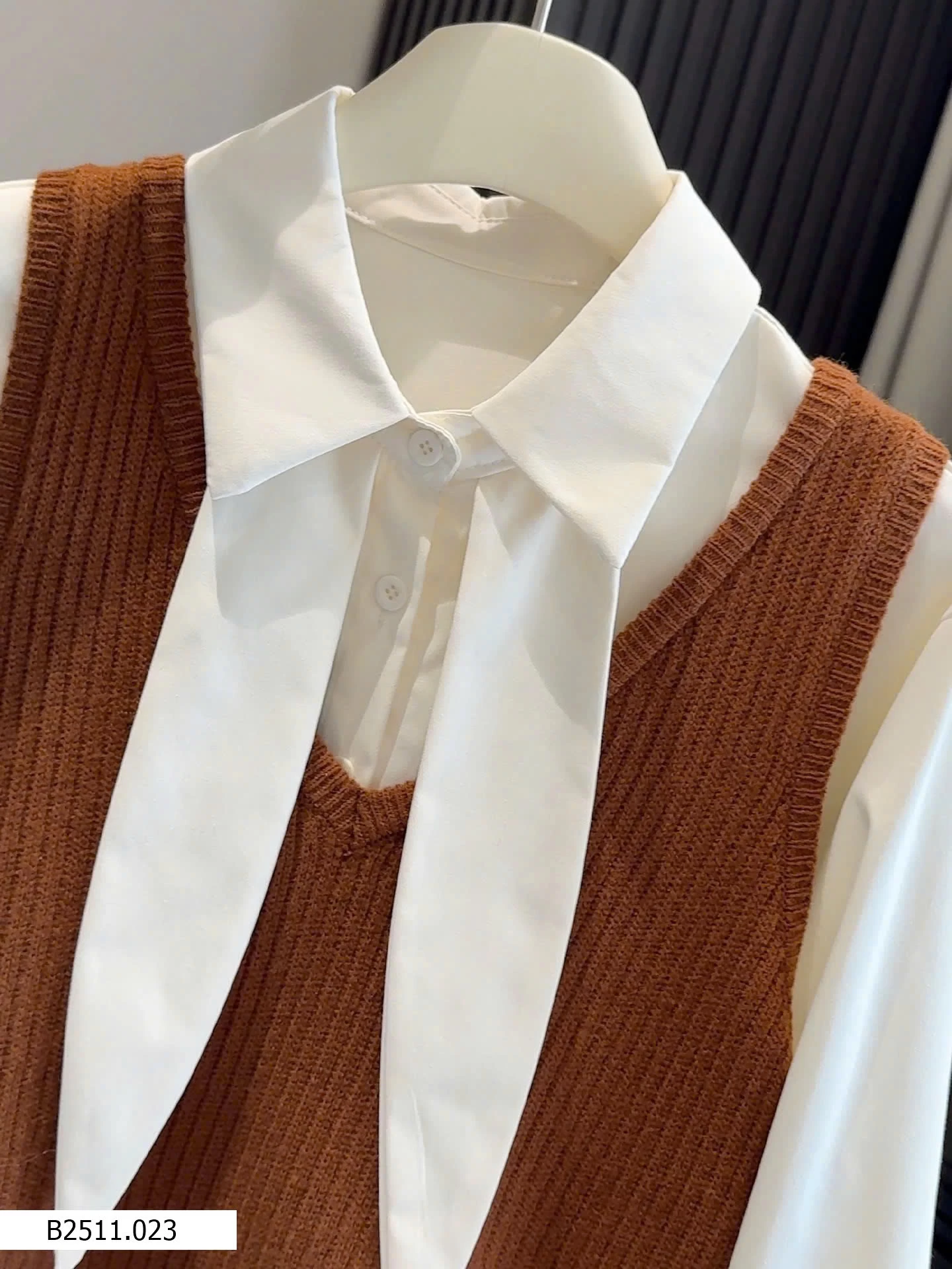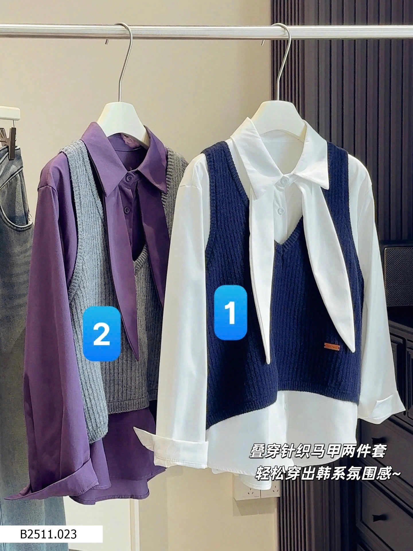 Bộ đồ hai mảnh phong cách Hàn Quốc dành cho nữ, trẻ trung và tôn dáng, gồm áo cánh có cổ kèm ruy băng và áo vest dệt kim cổ chữ V.