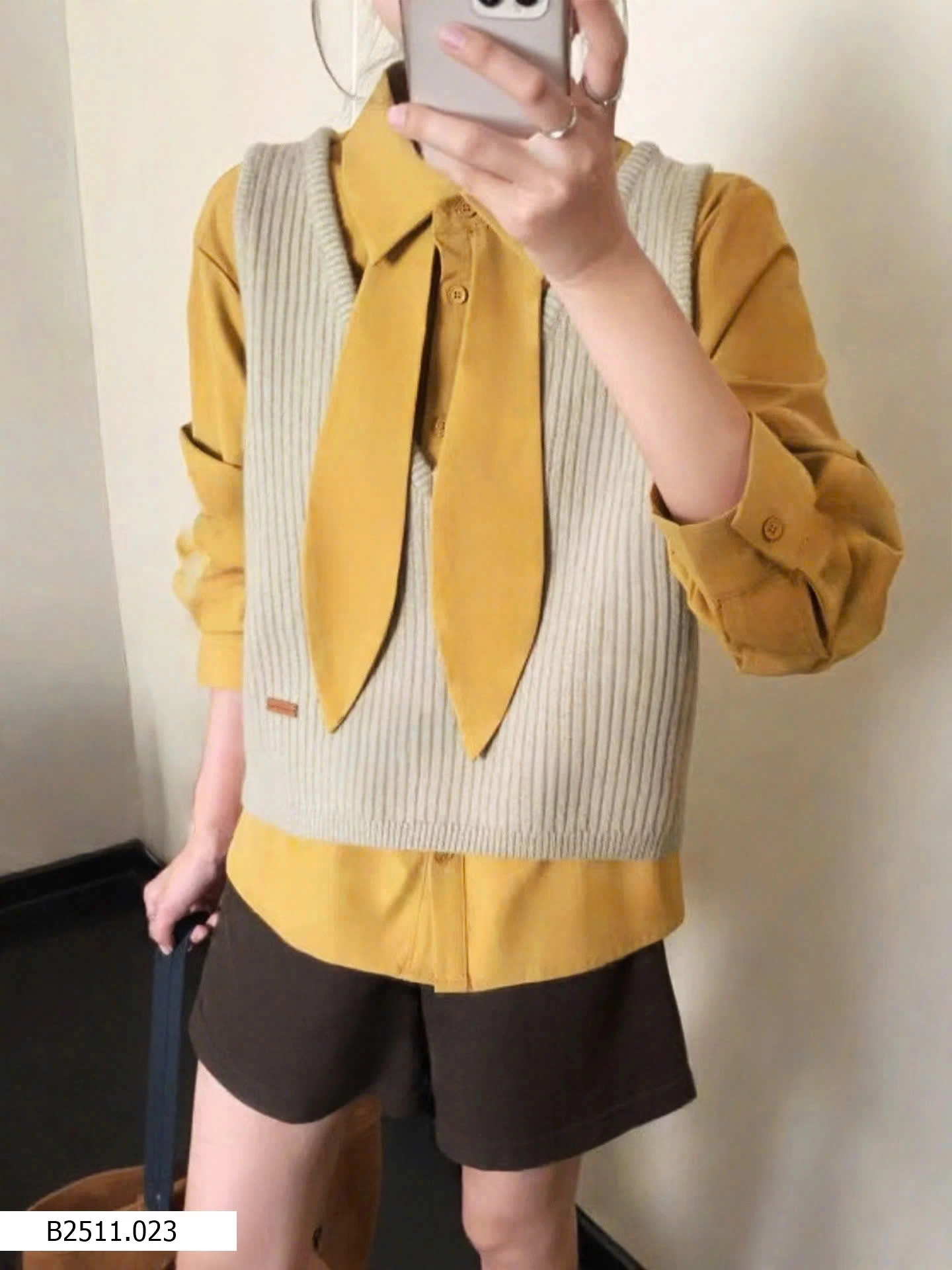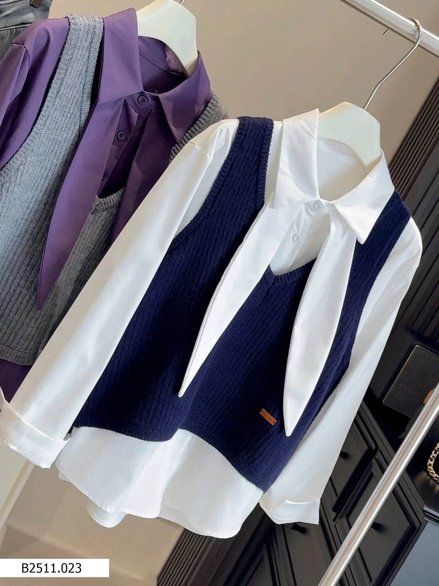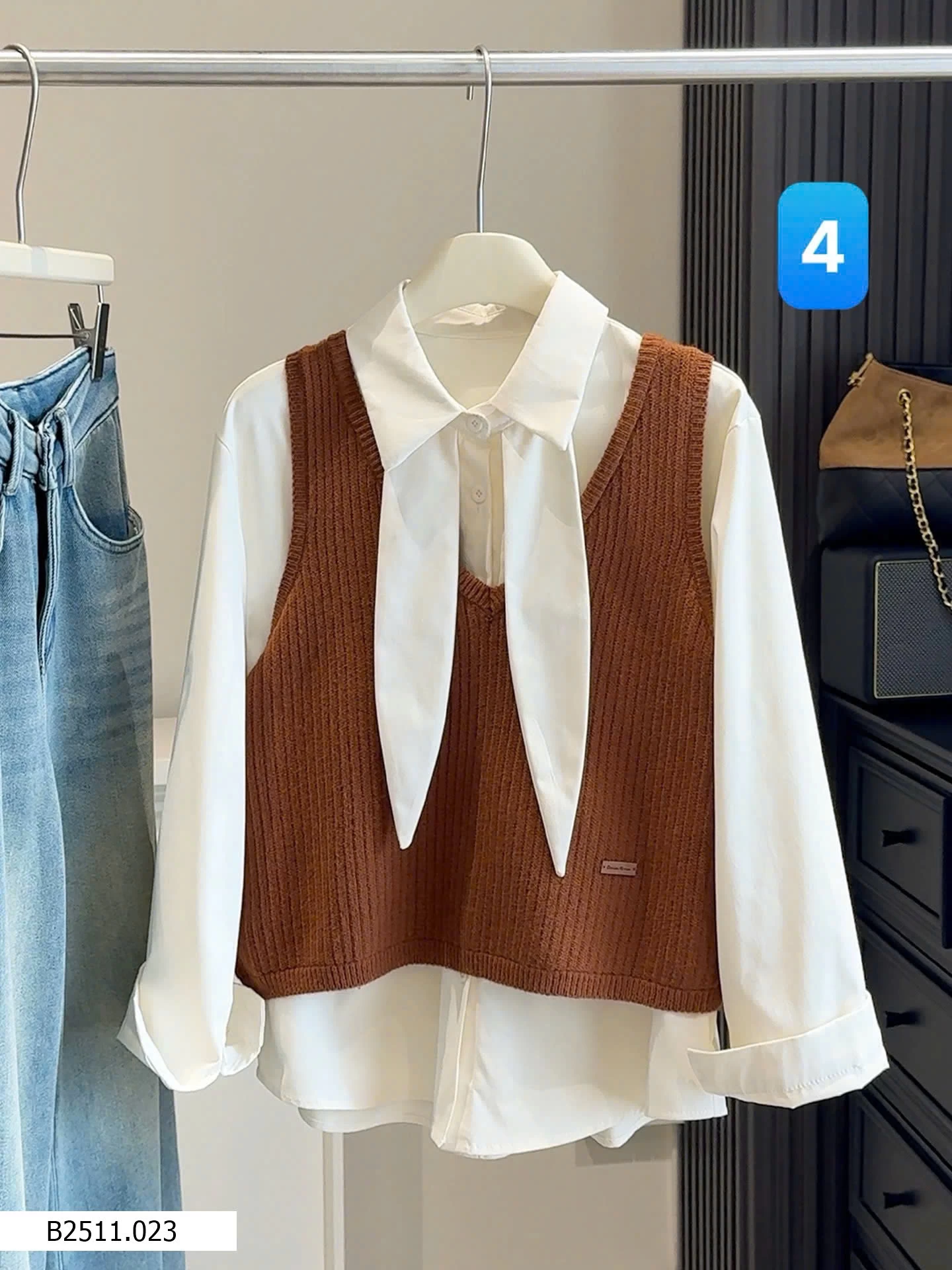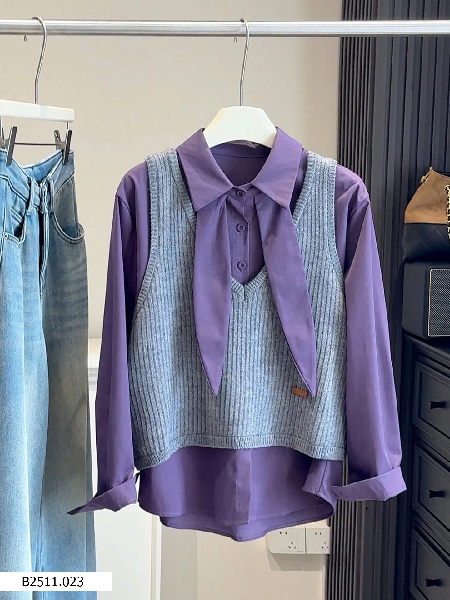 Bộ đồ hai mảnh phong cách Hàn Quốc dành cho nữ, trẻ trung và tôn dáng, gồm áo cánh có cổ kèm ruy băng và áo vest dệt kim cổ chữ V.