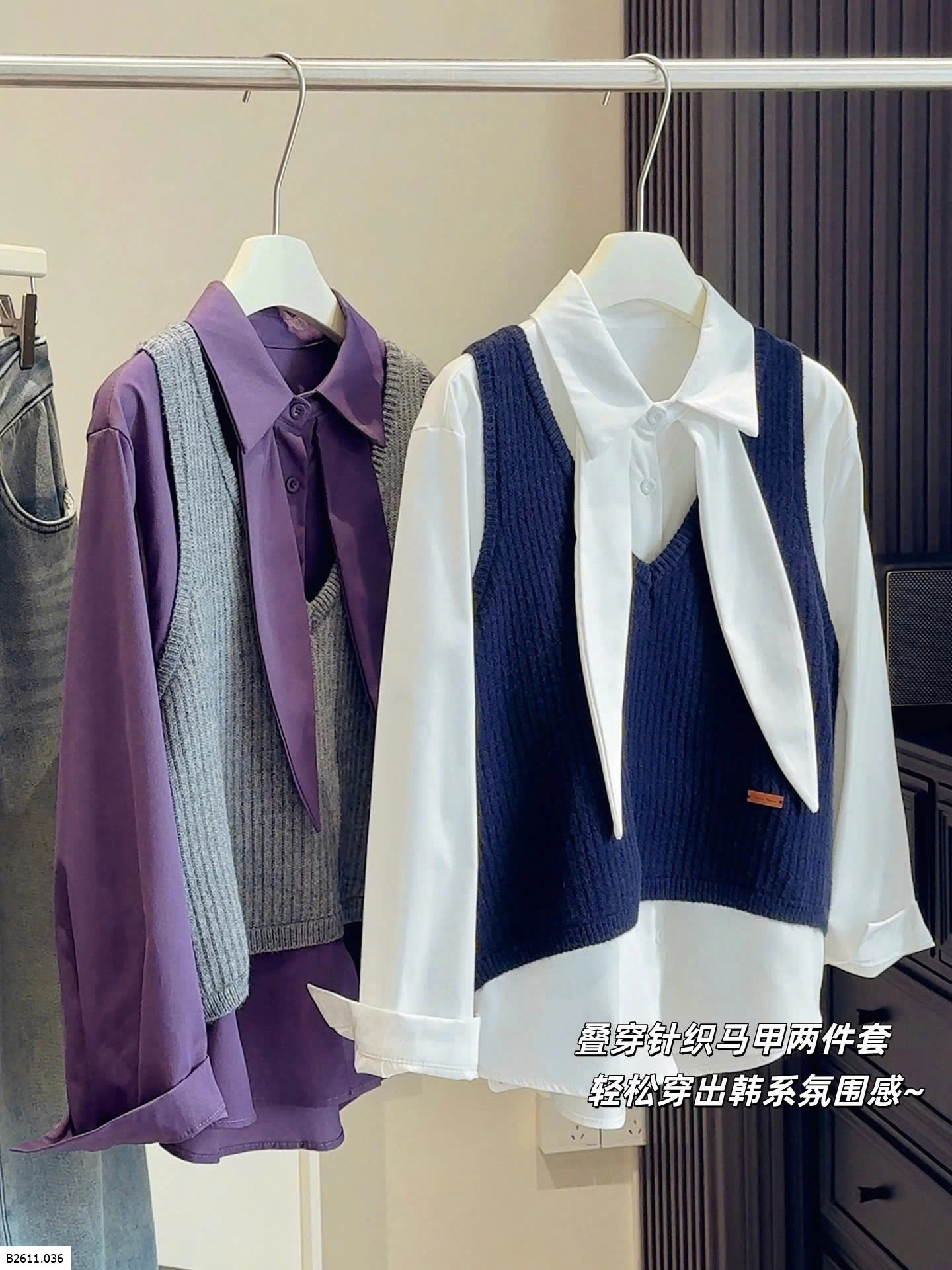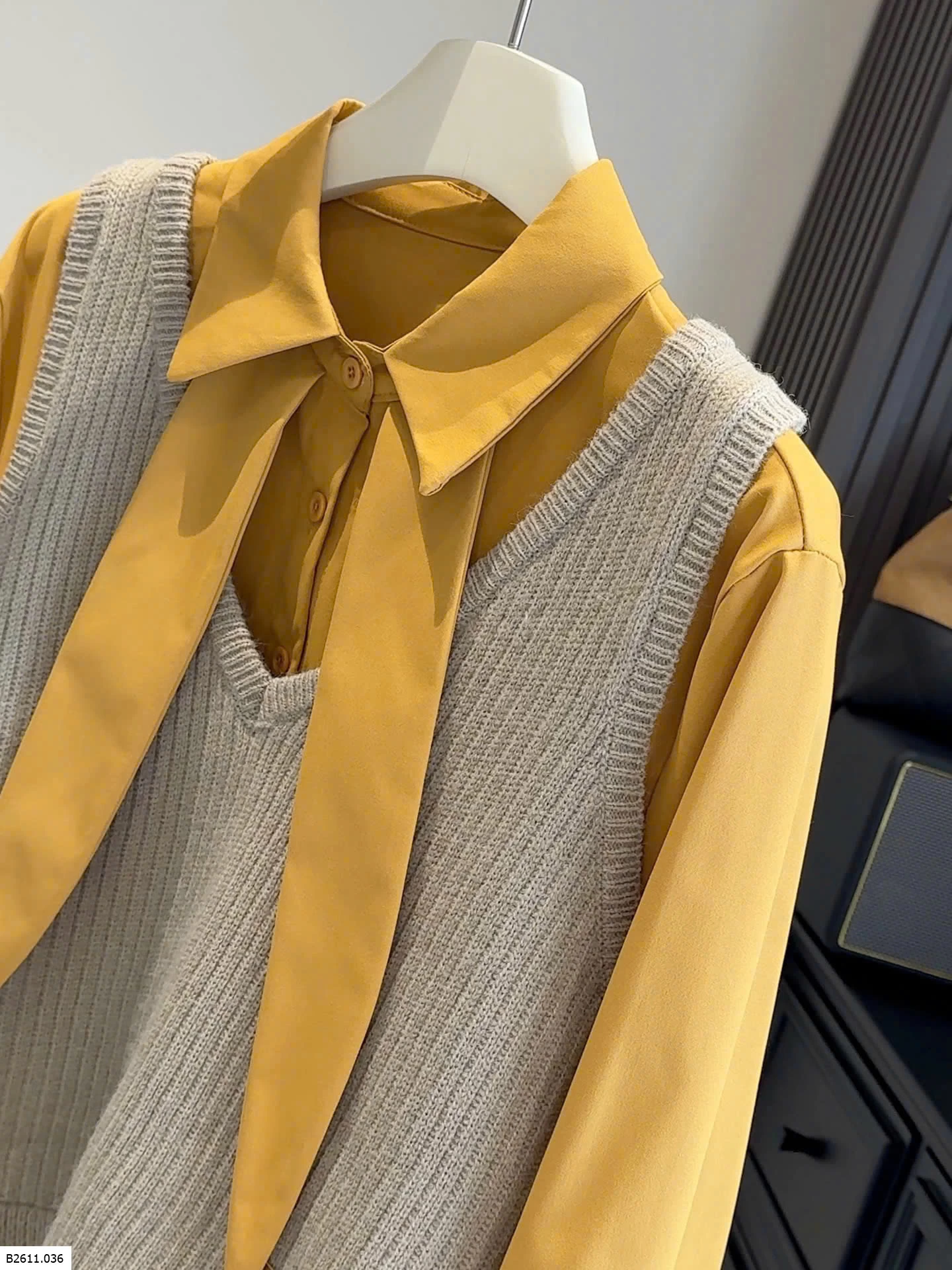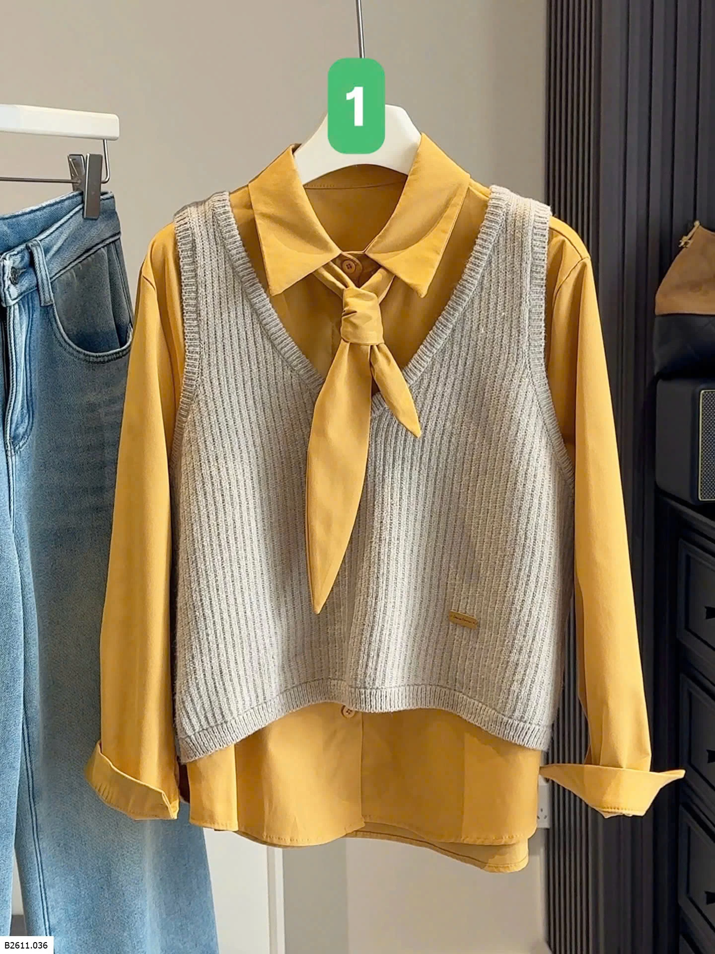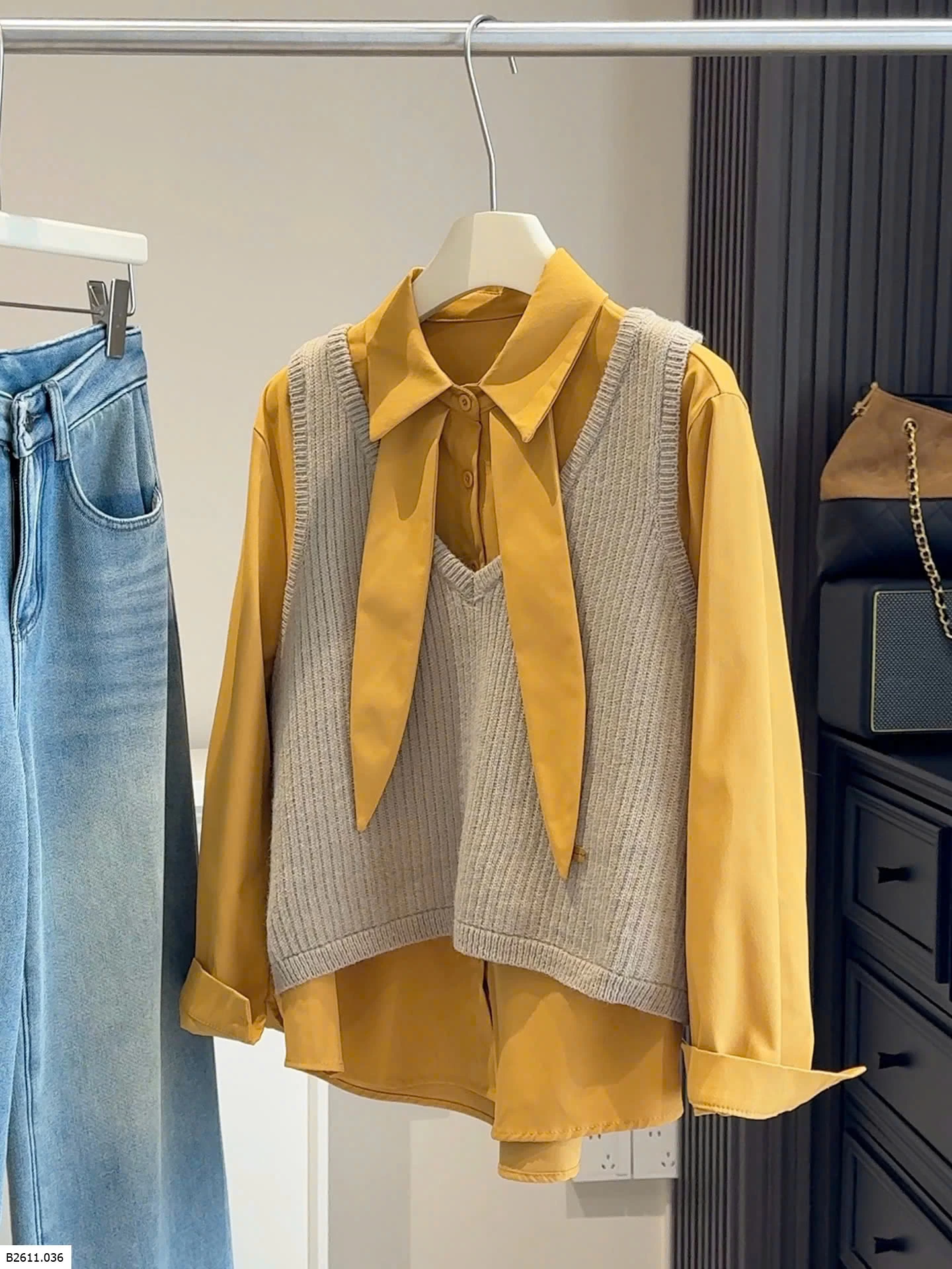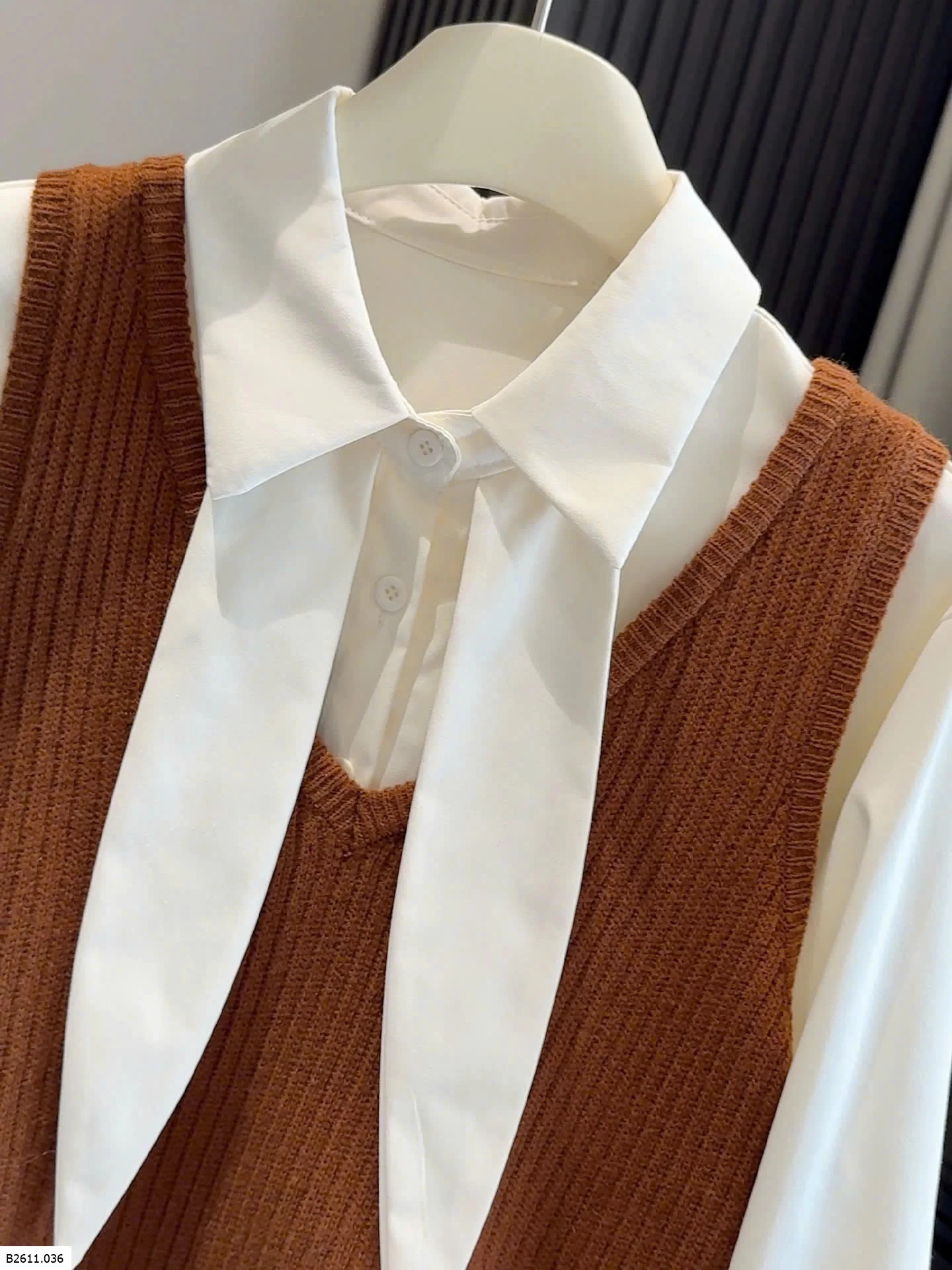 Bộ đồ hai mảnh phong cách Hàn Quốc dành cho nữ, trẻ trung và tôn dáng, gồm áo cánh có cổ kèm ruy băng và áo vest dệt kim cổ chữ V