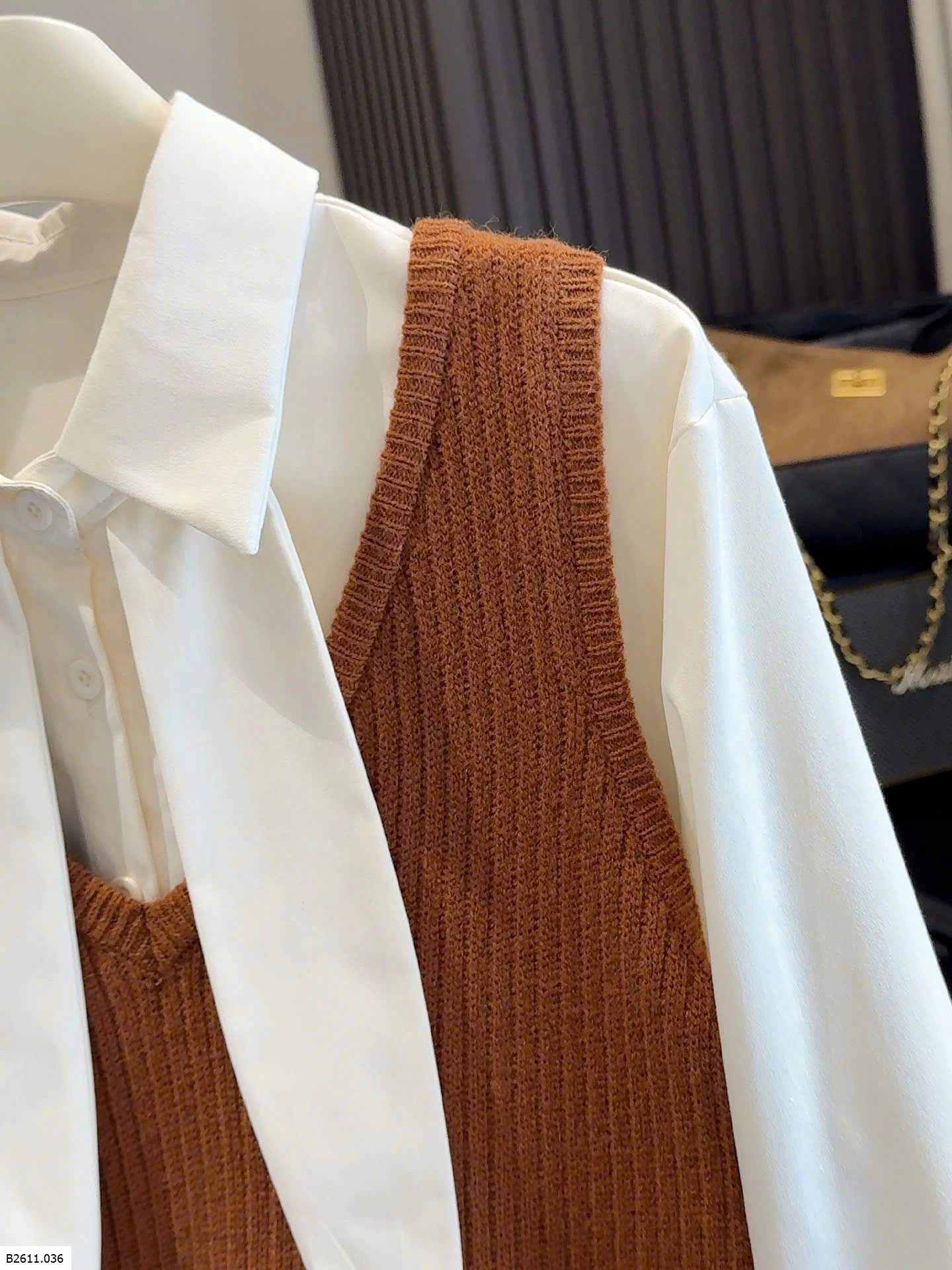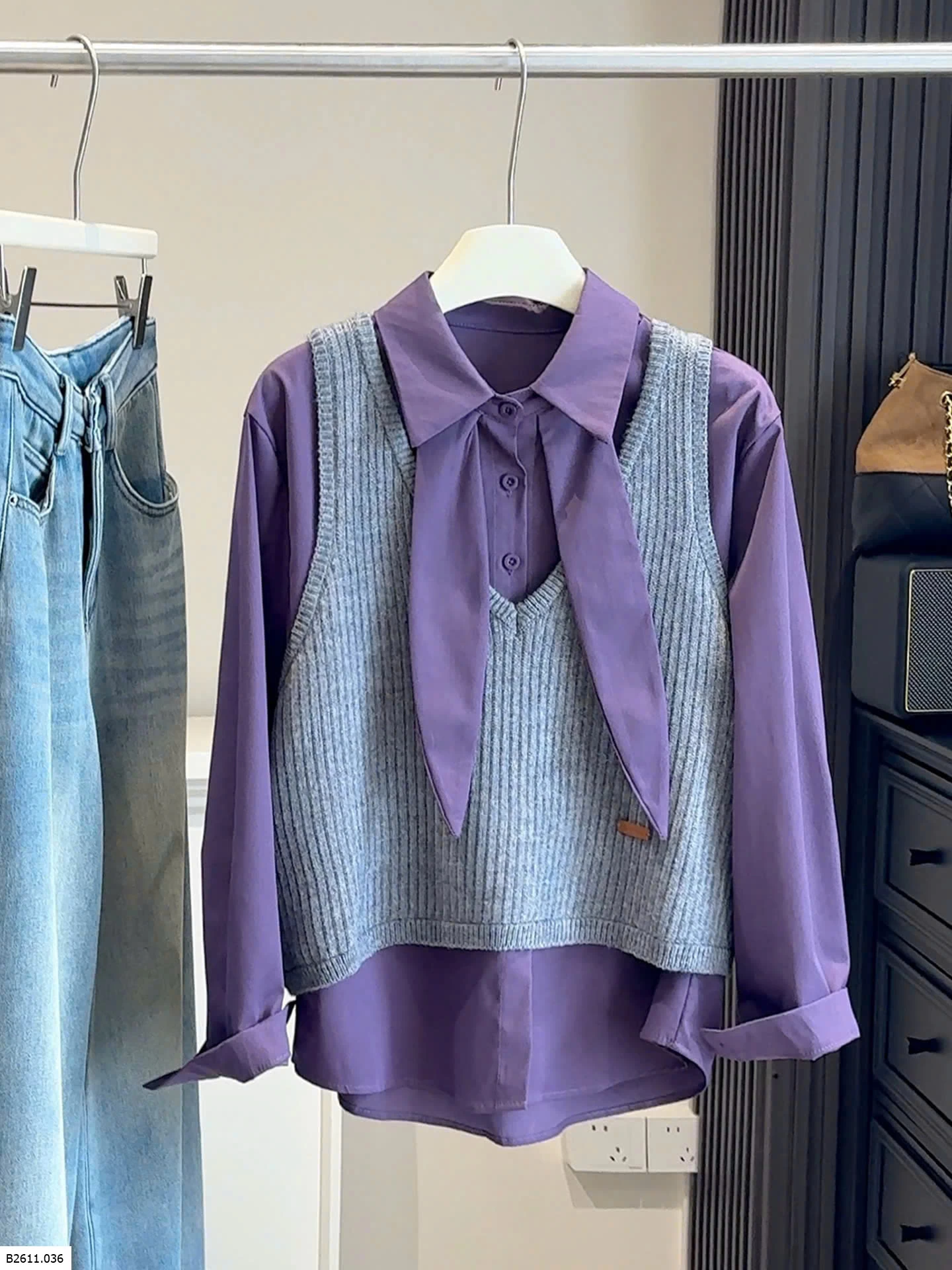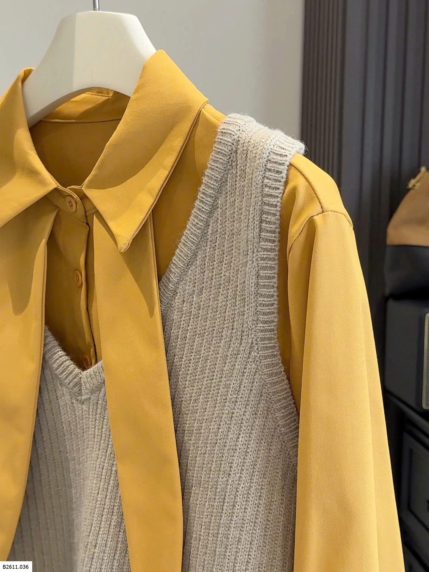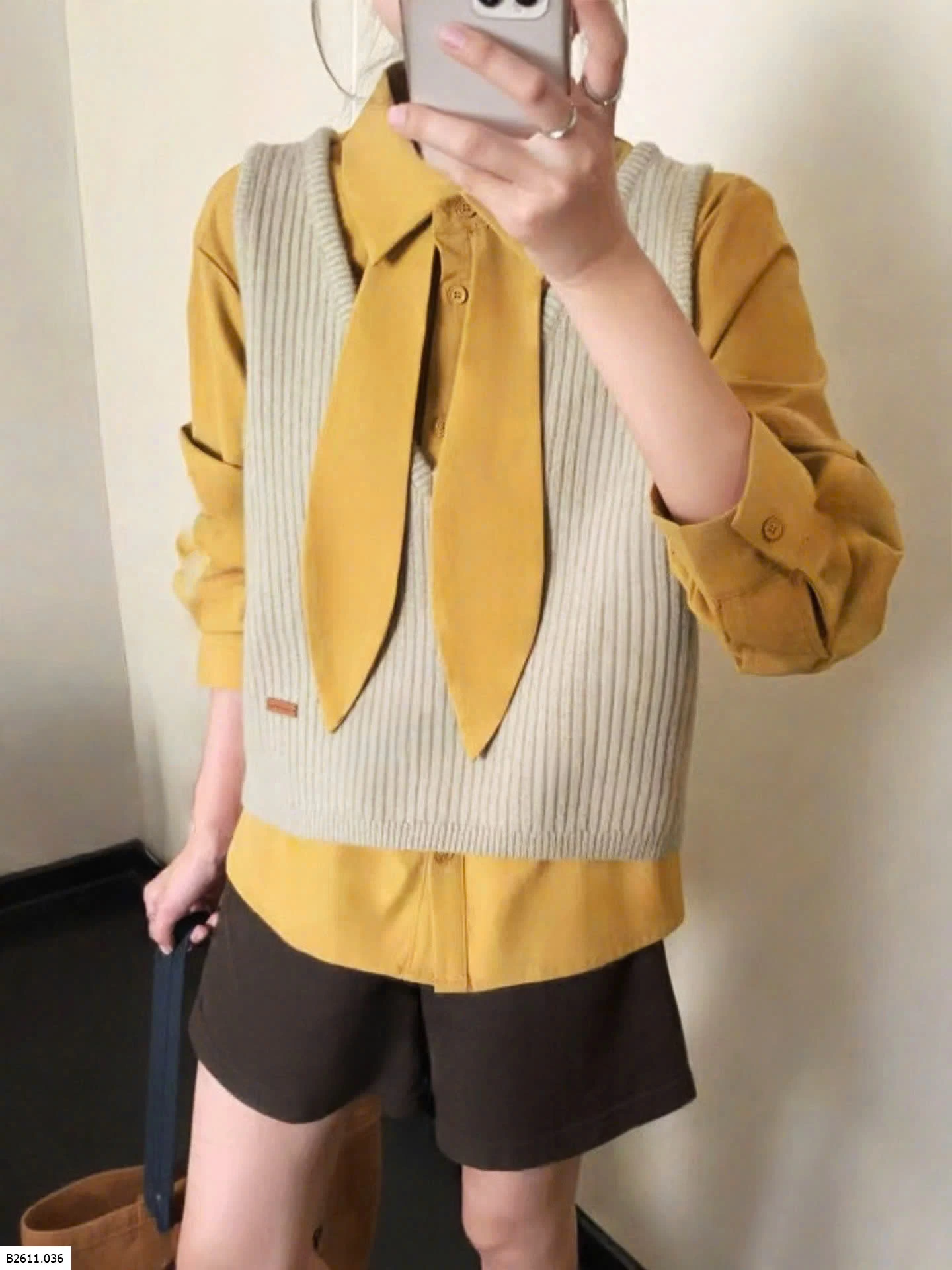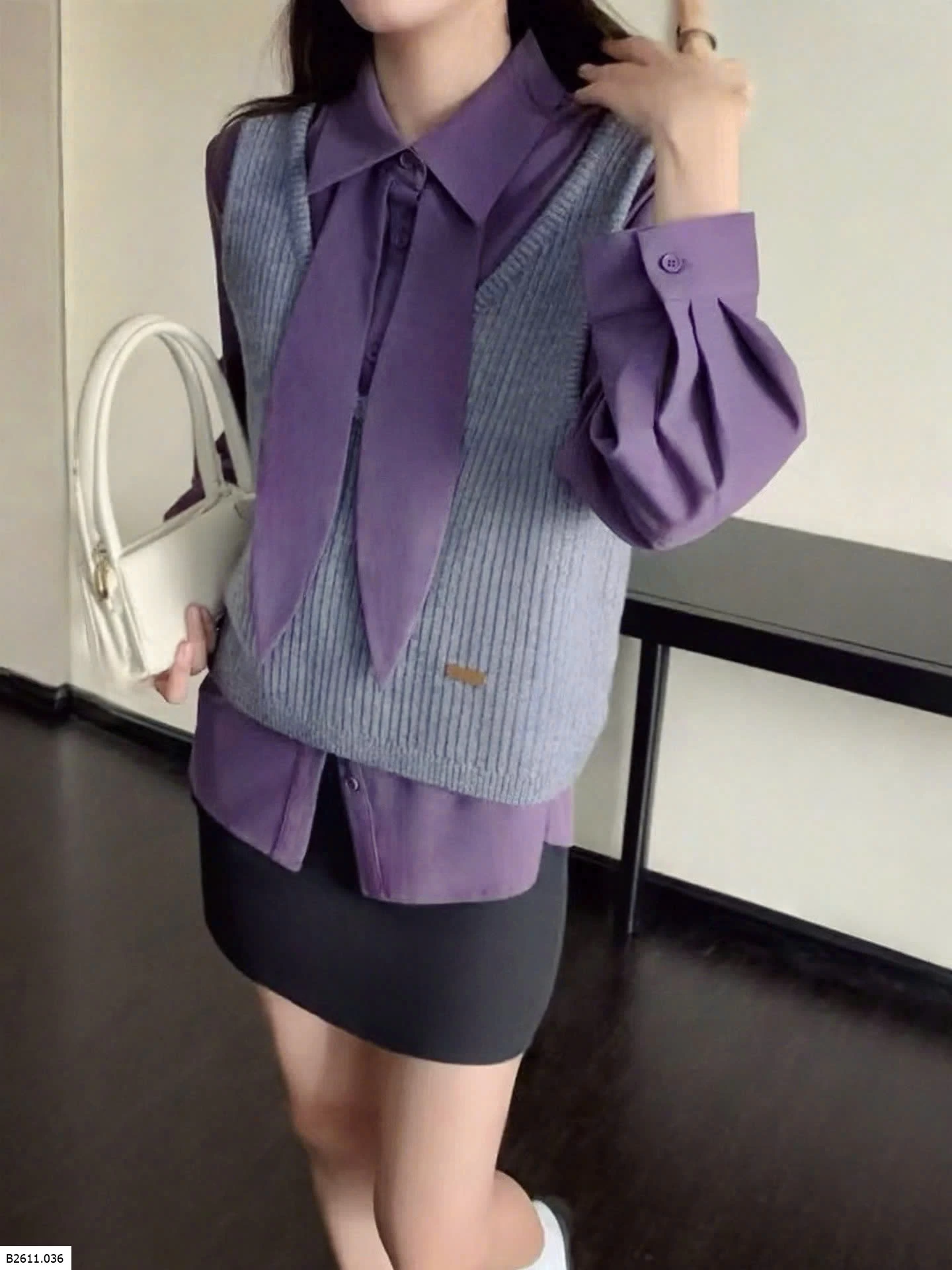 Bộ đồ hai mảnh phong cách Hàn Quốc dành cho nữ, trẻ trung và tôn dáng, gồm áo cánh có cổ kèm ruy băng và áo vest dệt kim cổ chữ V