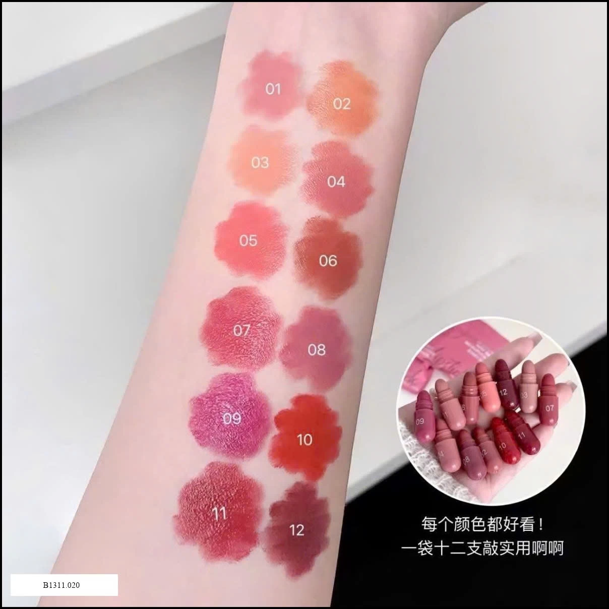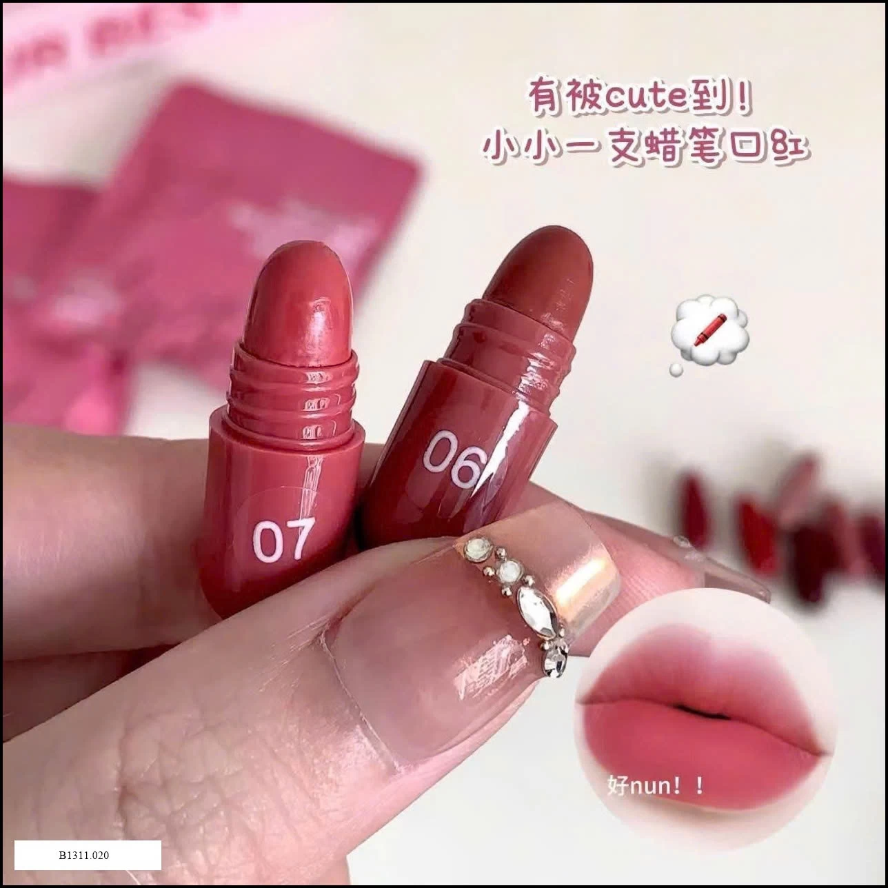 Son sáp nội địa thiết kế dạng viên thuốc độc đáo, bảng màu 12 tone thời thượng, lên môi mềm mượt, giữ ẩm tốt, không gây khô môi.