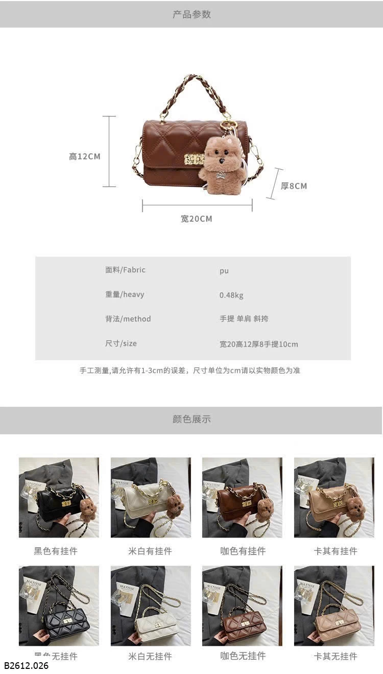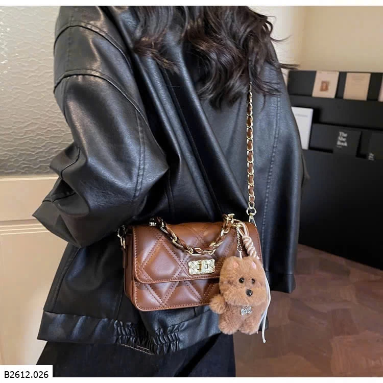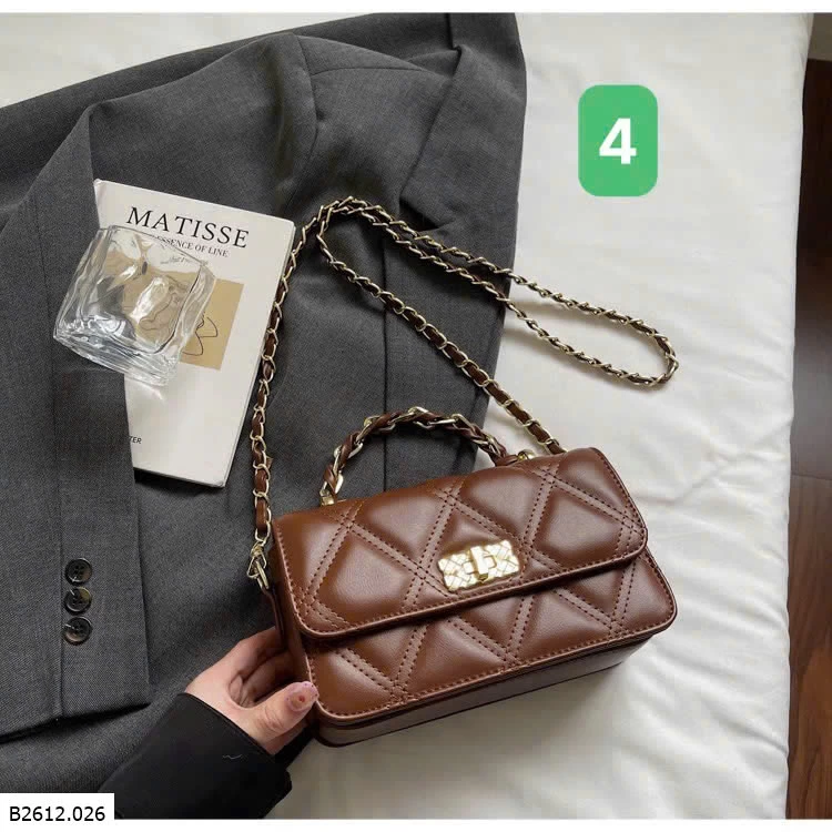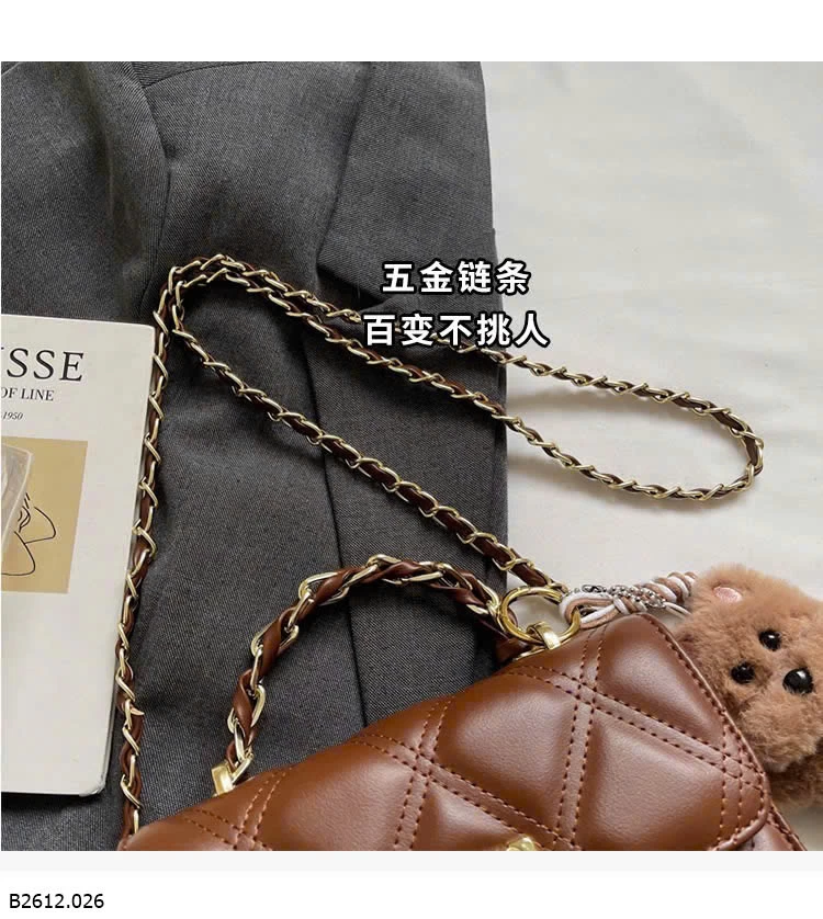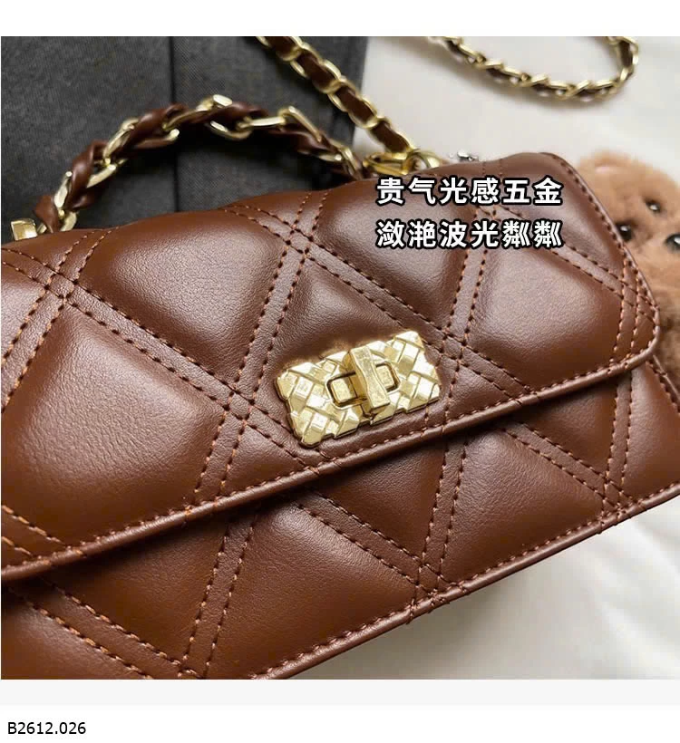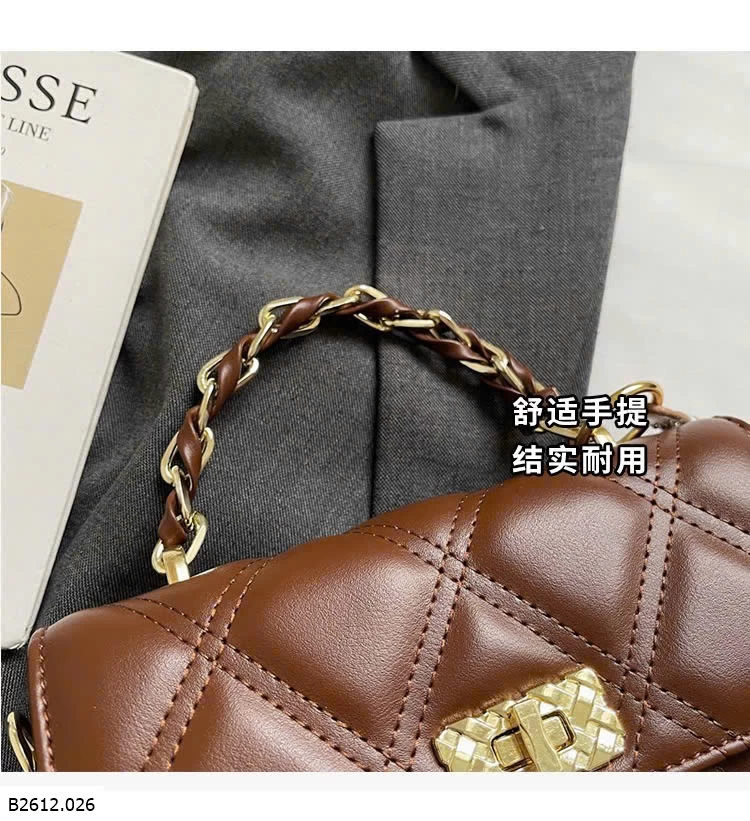 Thiết kế chần trám sang trọng, form nhỏ gọn dễ phối đồ. Khóa xoay kim loại chắc chắn, quai xích cầm tay + đeo chéo